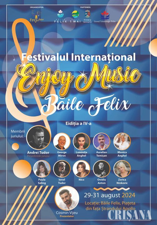 Cea de-a 4-a Ediție a Festivalului Internațional Enjoy Music se va desfășura în perioada 29-31 august, în Piațeta din fața ștrandului Apollo din Băile Felix.