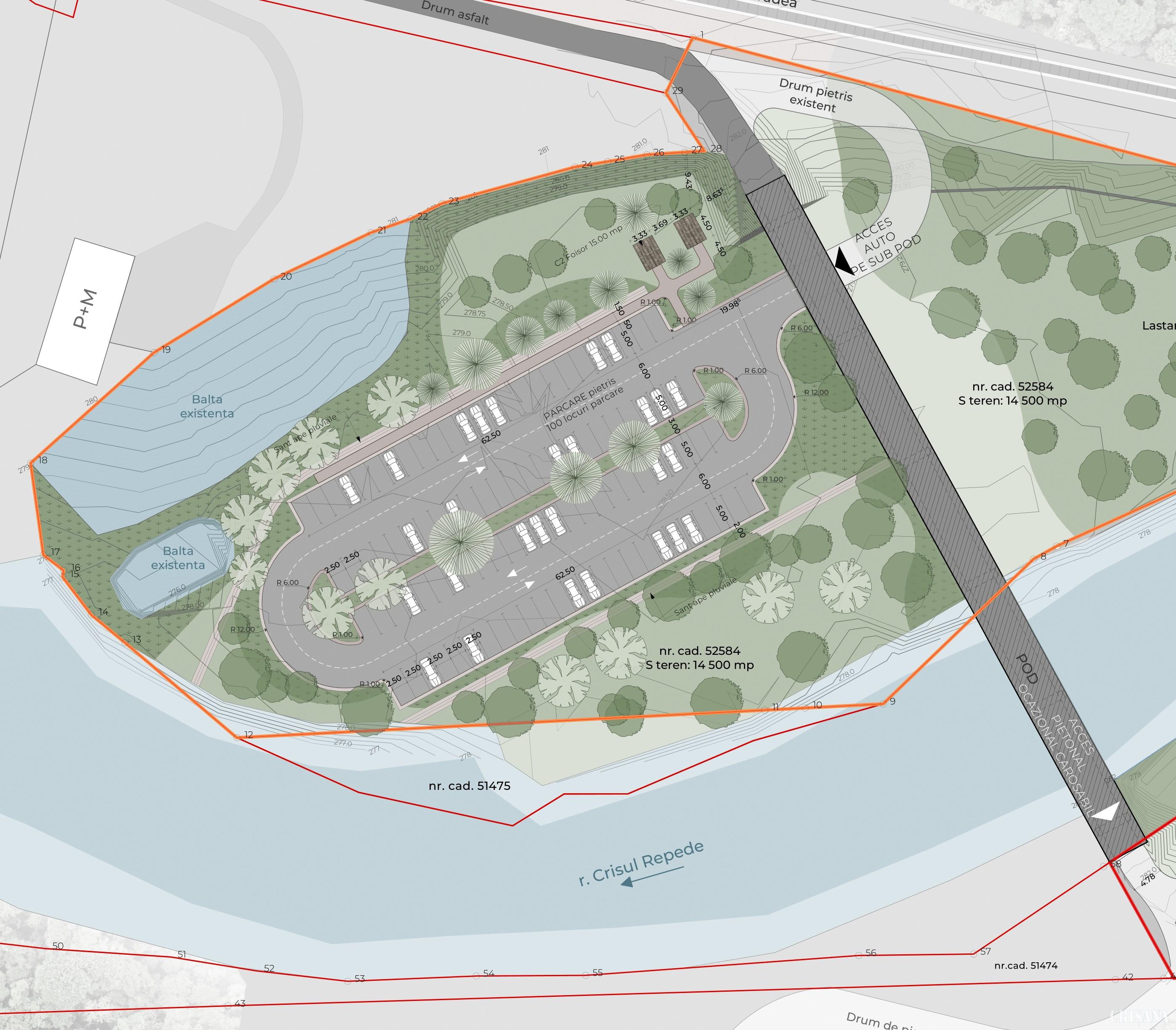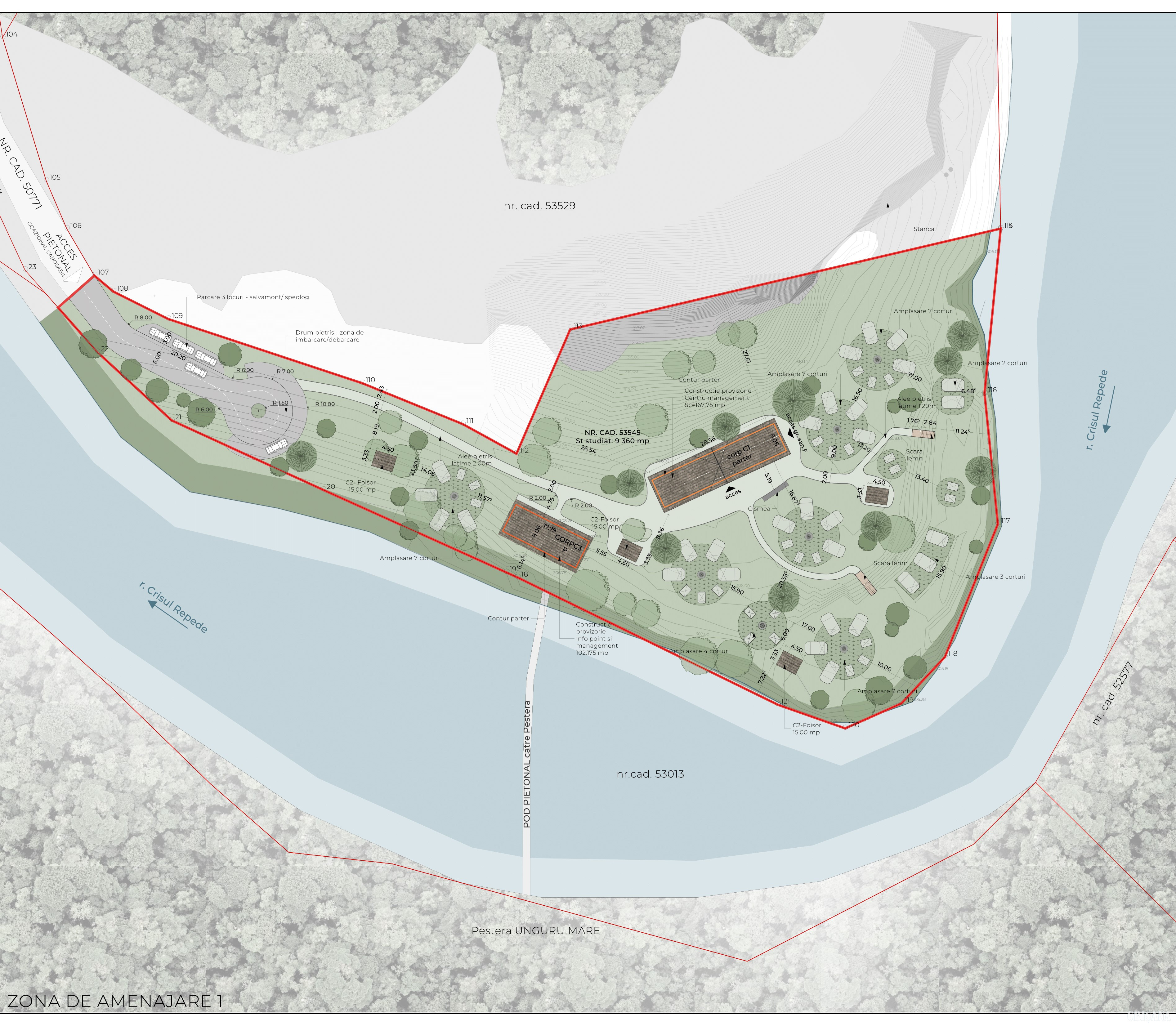 În comuna Vadu Crișului, la intrarea în Defileul Crișului Repede, proiectul prevede o parcare cu 100 de locuri, un centru de management, cercetare și educație ecologică, 8 foișoare și un spațiu de campare pentru 107 corturi. Investiția se ridică la 2,1 milioane de lei.
