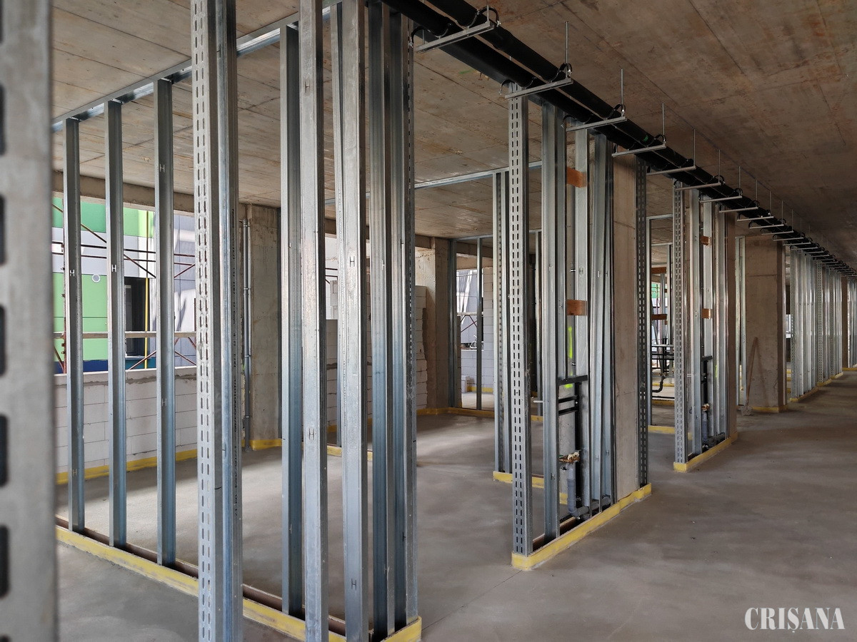 Constructorii au ajuns deja la planșeul mixt peste etajul 3, ultimul nivel al noului corp de clădire, unde se montează profilele metalice pe stâlpii din beton, cu ajutorul unei macarale de 200 de tone.
