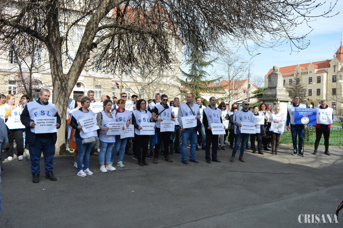 „E un paradox că noi am venit aici să protestăm pentru o Lege care nu este aplicată, Legea 53. Colegii noștri din nedidactică nici acum nu au ajuns la plafonul de bază stabilit de această lege. Protestăm și pentru colegii noștri din nedidactic, auxiliar și directorii unităților de învățământ. Acestea sunt categorii de personal care, în ultimii 4 ani, au fost mereu uitate. Ne dorim ca și colegii noștri din nedidactic și auxiliar să beneficieze de sporuri. Sunt singura categorie bugetară care nu are sporuri pentru condiții de muncă. Cei din inspectorate și minister au aceste sporuri, dar veriga de mijloc, cei din unitățile școlare, ei nu au. Colegii noștri care fac multe ore suplimentare nu sunt plătiți. Nu s-a găsit niciodată o soluție pentru ei. Profesorii care participă la olimpiade sau concursuri, unele dintre ele se desfășoară sâmbătă sau duminică, și unde este foarte multă muncă, nu sunt niciodată plătiți”, a spus liderul FSLI Bihor, Flaviu Zancu care mai adaugă că directorii au, de cele mai multe ori, al 10-lea sau al 15-lea salariu din școală. Acest lucru, raportat la câtă muncă și responsabilitate este la acel nivel, nu atrage pe nimeni să ocupe funcții de conducere ceea ce duce la o scădere a calității managementului școlilor. Profesorii mai vor o indexare a salariilor cu rata inflației, în fiecare an, și o normalizare a situației pe care o ocupă în grila de salarizare. „Vrem să fim pe o treaptă onorabilă, decentă. Nici primii, dar nici ultimii. Merită să fim undeva pe la jumătate, astfel încât meseria de dascăl să fie atractivă. Sperăm ca în perioada următoare să găsim înțelegere din partea guvernanților. Dacă nu, vom ajunge la proteste de stradă. În aprilie vom organiza la București un mare miting și apoi, în mai, vom organiza grevă generală în toate școlile”, a declarat Zancu, care, răspunzând întrebărilor jurnalistului Crișanei, a spus că problemele sunt într-adevăr mai vechi, că s-a încercat rezolvarea lor, dar că Guvernul a mințit, negociind niște lucruri cu sindicaliștii și punând în practică total altceva.