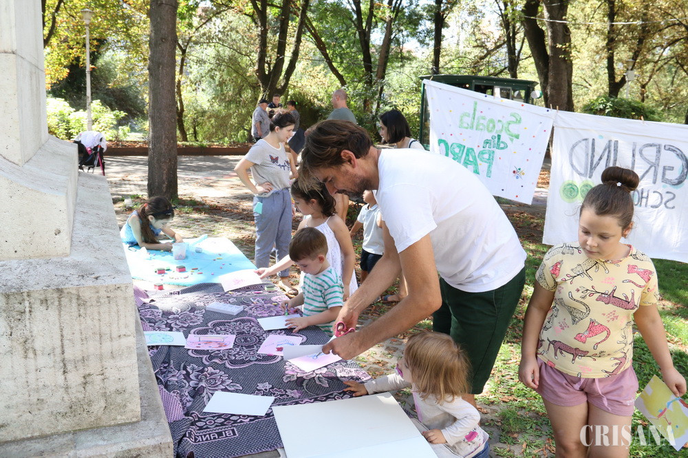 Atmosferă frumoasă sâmbătă în Parcul Libertății. În jur de 15 copilași, mai măricei sau cu suzete, se adunaseră în jurul statuii lui Szacsvay Imre pentru a desena. Atelierul a fost susținut de instructori din cadrul Asociației Grund Community materialele necesare fiind oferite gratuit fiecărui participant.
