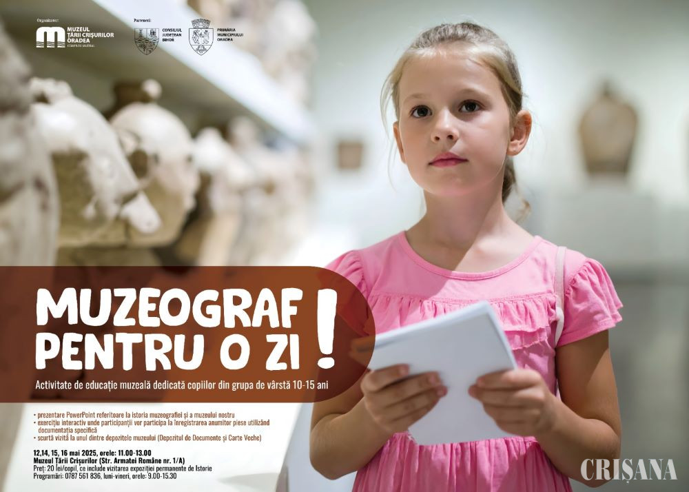 Activitatea de educație muzeală „Muzeograf pentru o zi!”, adresată elevilor cu vârste cuprinse între 10-15 ani, se va desfășura la sediul Muzeului Țării Crișurilor Oradea - Complex Muzeal.