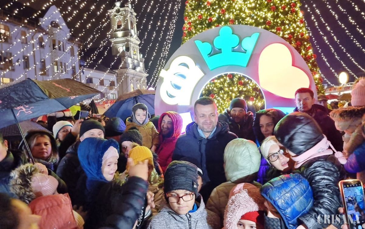 Sute de orădeni s-au adunat joi seara în Piața Unirii din Oradea, chiar dacă a plouat, pentru a asista la momentul aprinderii iluminatului de sărbători și la deschiderea Târgului de Crăciun.