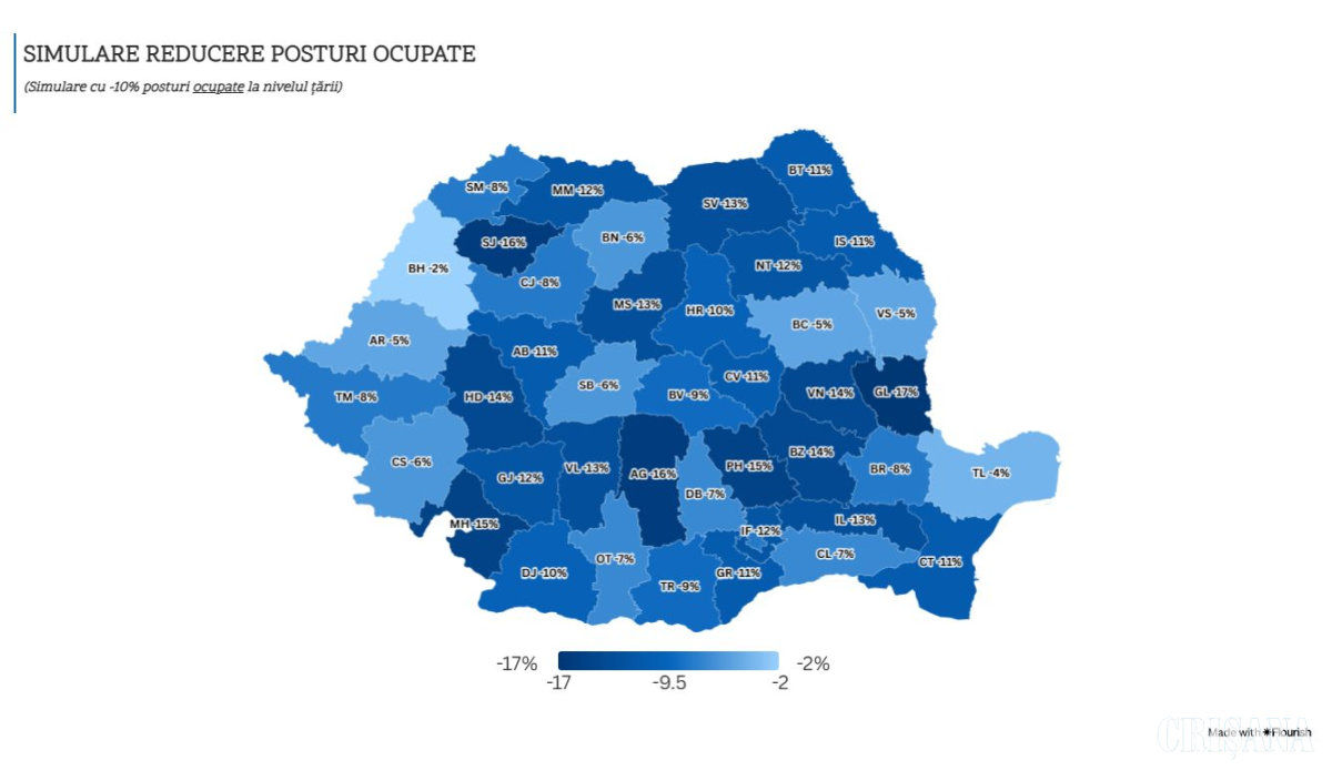 Județele cele mai afectate sunt: Prahova –724 posturi (–15%), 68 UAT-uri vizate (65%); București –709 posturi (–8%), 4 UAT-uri vizate (57%); Argeș –649 posturi (–16%), 58 UAT-uri vizate (56%); Suceava –627 posturi (–13%), 48 UAT-uri vizate (42%); Mureș –513 posturi (–13%), 56 UAT-uri vizate (54%); Galați –522 posturi (–17%), procentul cel mai ridicat de reducere – 92% dintre UAT-uri vizate.