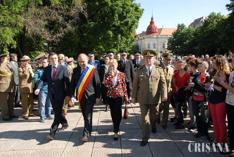 Printre oficialităţile prezente la eveniment s-au numărat: Ilie Bolojan, primarul municipiului Oradea, viceprimarii Biro Rozalia şi Florica Cherecheş, precum şi Dumitru Voloşeniuc, preşedintele interimar al Consiliului Judeţean Bihor. Guvernul României a fost reprezentat la festivităţi de inspectorul guvernamental Cristian Bitea, cel care va ocupa, în viitor, funcţia de subprefect. Ceremonialul militar a început cu întâmpinarea oficialităţilor, urmată de prezentarea onorului, salutarea drapelului de luptă şi a gărzii de onoare, şi ocuparea locului în dispozitiv. Programul a continuat cu un Te Deum, oficiat de Mircea Ioniţă, preotul militar al Garnizoanei Oradea, după care au urmat alocuţiunile rostite de Florin Băran, director în cadrul Prefecturii, şi prof. univ. dr. Viorel Faur, care au vorbit despre triplul eveniment care este marcat la 9 mai: Independenţa de Stat a României, Victoria Naţiunilor Unite şi Ziua Europei. Programul a continuat cu depuneri de coroane, jerbe şi buchete de flori din partea Prefecturii, Consiliului Judeţean, Primăriei Oradea, Asociaţiei Naţionale a Cadrelor Militare în Rezervă şi în Retragere - Filiala Bihor, Asociaţiei Naţionale Cultul Eroilor - Filiala Bihor, Asociaţiei Pro Basarabia şi Bucovina - Filiala Bihor, Inspectoratului Şcolar Judeţean Bihor, Universităţii Oradea, DSP Bihor, DSVSA Bihor, Comunităţii Evreilor din Oradea, Sindicatului Cadrelor Disponibilizate din Bihor etc. De asemenea, au participat, în număr mare, elevi de la mai multe unităţi de învăţământ orădene: Şcoala cu clasele I-VIII "Dimitrie Cantemir" (clasa I C, a profesoarei Doina Lung), Colegiul Naţional "Iosif Vulcan" (clasele a X-a C şi a XI-a D, însoţiţi de profesoarele Alexandrina Crăciun, Dana Mihincău şi Angela Dacin), Şcoala cu clasele I-VIII "Octavian Goga" (însoţiţi de prof. Lucian Scurtu), precum şi de la Colegiul Naţional "Emanuil Gojdu şi Cercul "Cultul Eroilor" al şcolii. Din partea partidelor politice, cea mai numeroasă prezenţă a fost a celor de la USL şi PDL. Ceremonialul militar s-a încheiat cu defilarea gărzii de onoare pe muzica fanfarei militare a Şcolii de Pregătire a Agenţilor Poliţiei de Frontieră "Avram Iancu".