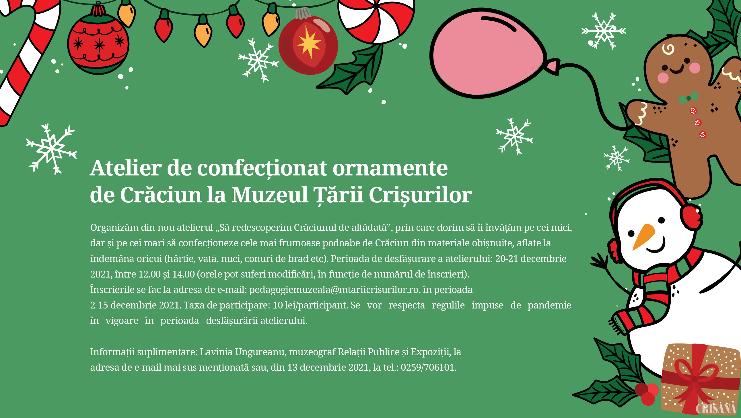 „Prin organizarea acestui atelier dorim să îi învățăm pe cei mici, dar și pe cei mari să confecționeze cele mai frumoase podoabe de Crăciun din materiale obișnuite, aflate la îndemâna oricui (hârtie, vată, nuci, conuri de brad etc.)”, au transmis reprezentanţii Muzeului. Perioada de desfășurare a atelierului este: 20-21 decembrie 2021, între 12.00 și 14.00. Orele pot suferi modificări, în funcție de numărul de înscrieri.