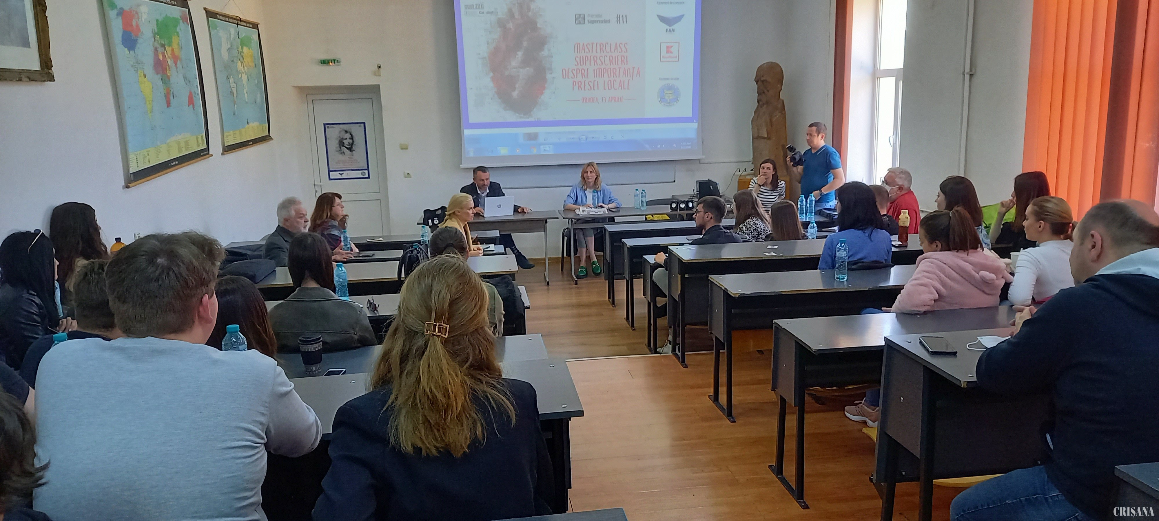 Amfiteatrul Nicolae Iorga al Facultății de Istorie, Relații internaționale, Științe politice și Științele Comunicării, din cadrul Universității din Oradea, a găzduit, ieri, o întâlnire a jurnaliștilor din presa locală cu profesorii și studenții facultății, în cadrul masterclassului „Superscrieri”.