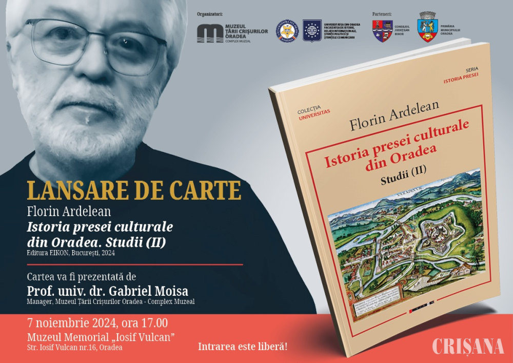 La Muzeul Memorial „Iosif Vulcan” (str. Iosif Vulcan nr. 16), joi, 7 noiembrie, de la ora 17.00, va avea loc lansarea cărții „Istoria presei culturale din Oradea. Studii (II)”, al cărei autor este Florin Ardelean și care a apărut la Editura Eikon, București, 2024.