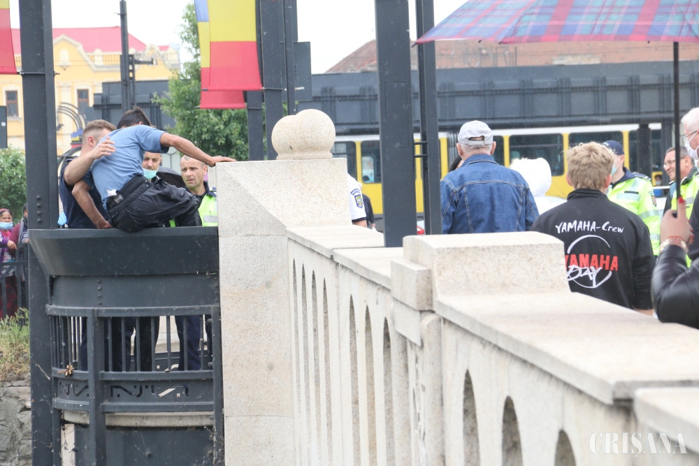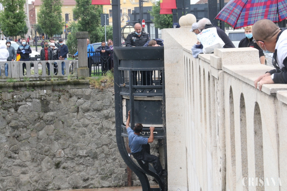Lupu de la Oradea a coborât sub unul dintre balcoanele de fier forjat ale podului, strigând cât îl ţinea gura, spre groaza trecătorilor. Acolo a început să vocifereze, fiind în pericol de câteva ori să cadă în râu din cauza agitaţiei. Un trecător a sunat la 112, mai multe echipaje de poliţie sosind la faţa locului. Poliţiştii au intrat în vorbă cu el, reuşind în câteva minute să-l convingă să urce din nou pe pod. Printre zecile de orădeni care s-au oprit în zonă, Lupu de la Oradea a fost urcat într-o maşină a poliţiei şi dus pentru acordarea de ajutor medical.