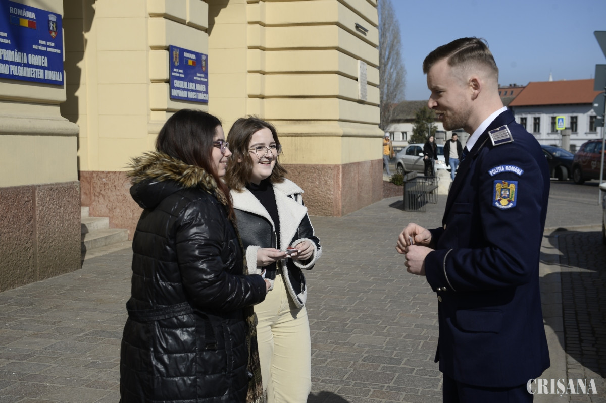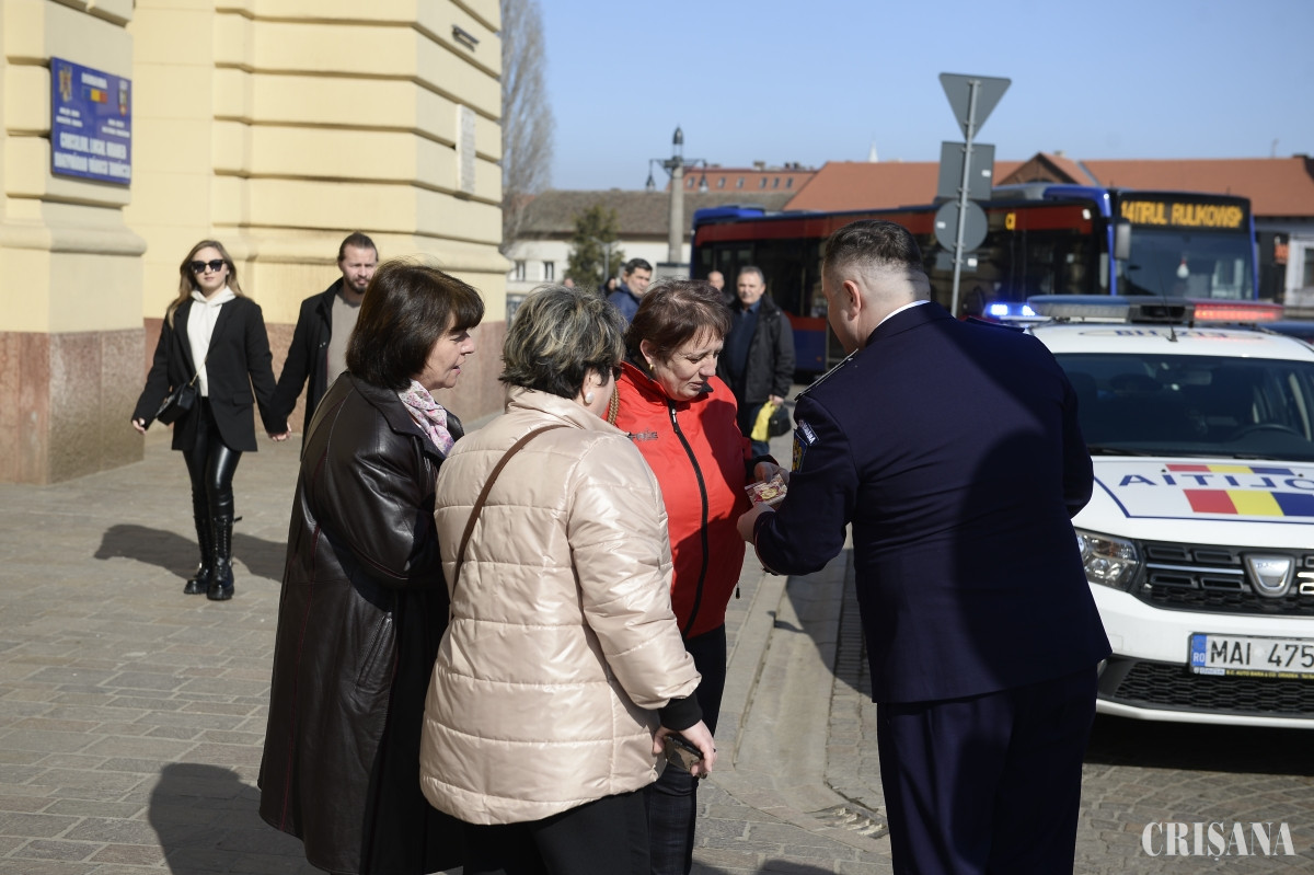 Astfel, ieri dimineaţă, preșcolarii s-au alăturat demersului polițiștilor bihoreni și, alături, de ei, au distribuit mărțioarele cu mesaje preventive, pe platoul din fața Crișul Shopping Center Oradea, pe strada Republicii din Oradea, în zona pietonală, dar și în proximitatea centrului comercial Lotus. De asemenea, polițiștii de prevenire alături de polițiștii rutieri bihoreni au fost prezenți în zona Pieței Unirii din municipiul Oradea și au oferit doamnelor și domnișoarelor participante la trafic, în calitate de conducător auto sau pieton, mărțișoare cu recomandări preventive. În acțiunea din Piața Unirii au fost implicați și reprezentanții Centrului de Prevenire, Evaluare și Consiliere Antidrog Bihor.