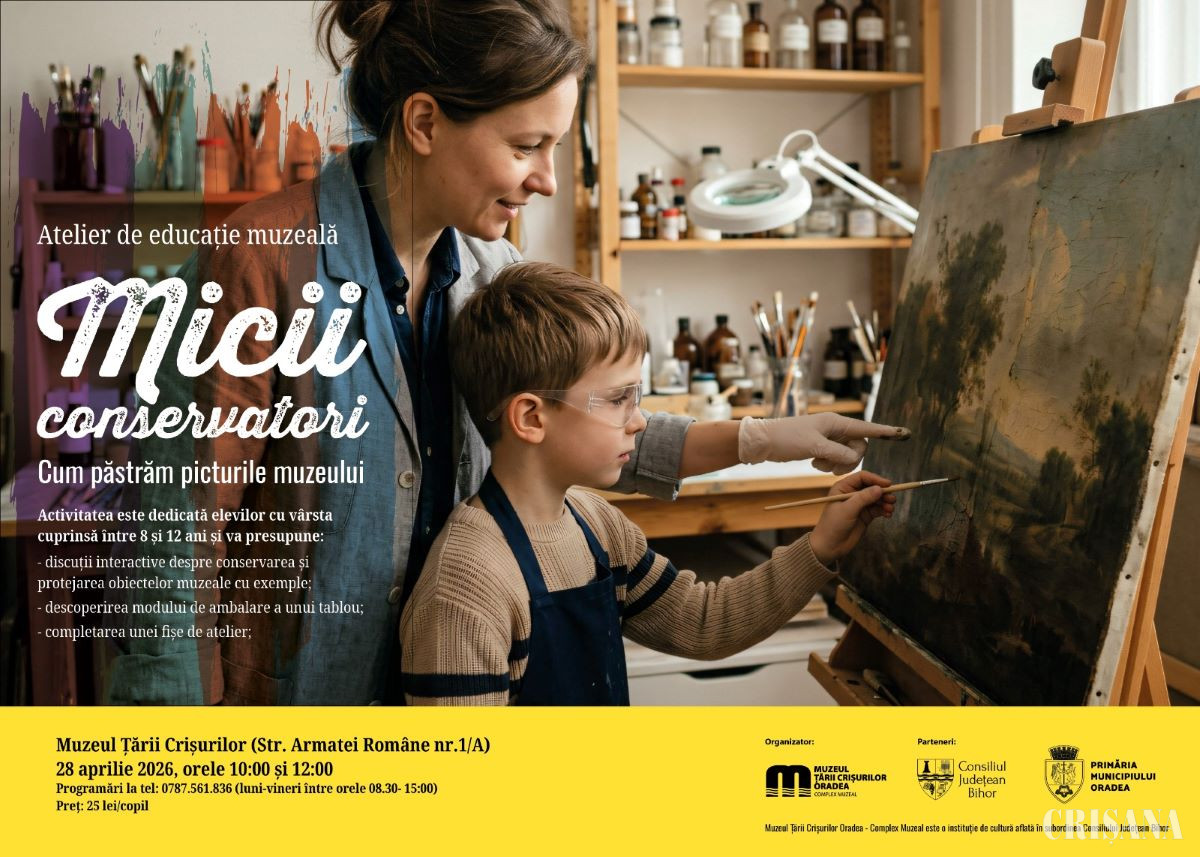 Muzeul Țării Crișurilor Oradea – Complex Muzeal organizează, împreună cu Consiliul Județean Bihor și Primăria Municipiului Oradea, atelierul de educație muzeală „Micii conservatori: Cum păstrăm picturile muzeului”. Acesta se va desfășura în data de 28 aprilie, de la orele 10.00 și 12.00, la sediul instituției (str. Armatei Române nr. 1/A).