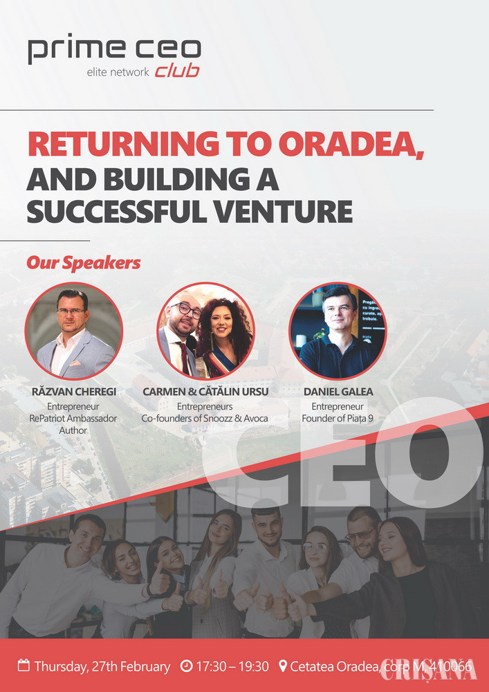 Pentru a celebra debutul seriei de evenimente, Prime CEO Club organizează o seară de networking „alt fel” pentru antreprenorii orădeni. Evenimentul „Întorși acasă, au creat afaceri de succes” va avea loc pe data de 27 februarie, între orele 17.30 și 19.30, în corpul M al Cetății Oradea.