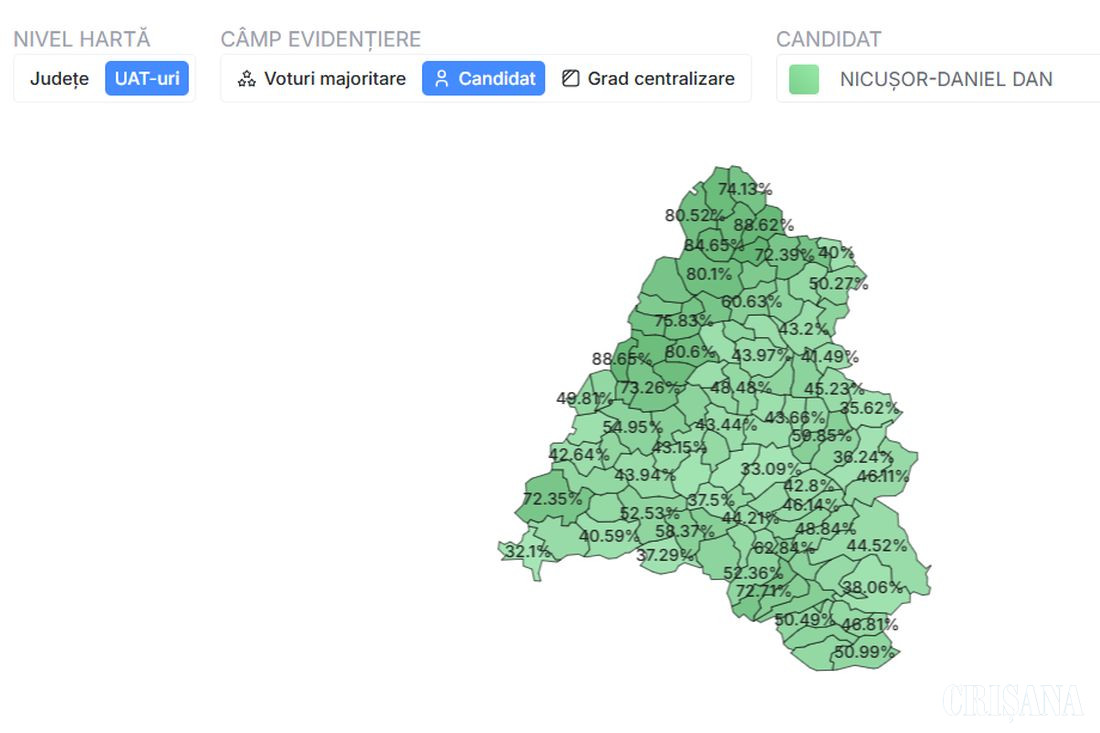 În județul Bihor Nicușor Dan a câștigat alegerile cu un procent de 63,64% (182.029 voturi), în timp ce George Simion a strâns 36,36% (103.995 voturi). În municipiul Oradea Nicușor Dan a câștigat detașat cu 73,26%, înregistrând scoruri bune în toate celelalte orașe: Aleșd 55,06%, Beiuș 62,84%, Marghita 72,99%, Salonta 72.35%, Săcueni 80,1%, Ștei 58,76%, Vașcău 53,66%, Valea lui Mihai 84,75%. Singurul „oraș” pierdut de Dan este Nucetul, unde a înregistrat doar 455 voturi (46,81%). Nordul județului a votat masiv cu Nicușor Dan, în timp ce sudul l-a preferat pe George Simion – comuna Pietroasa 61,94%, Dobreștiul 66,91%, Olcea 62,71%, Borod 64,38%, Avram Iancu 67,9%.
