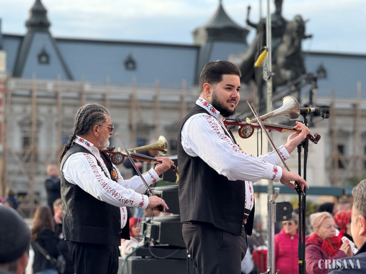 În Piața Unirii, „danțul” a început pe notele viorii cu goarnă, alături de tarafurile tradiționale: Taraful lui Stângaciu, Taraful lui Cristi Laboș și Taraful lui Zbiciu. Atmosfera a fost completată de aromele vinurilor locale, oferite de cramele bihorene prezente și de spiritul cald al comunității adunate în jurul tradițiilor. „Inima orașului” a vibrat cu emoție și energie deopotrivă, iar publicul a răspuns cu entuziasm, intrând în joc și aplaudând cu bucurie fiecare moment artistic. Mulți dintre cei prezenți au purtat piese vestimentare populare, contribuind la frumusețea și unitatea spectacolului colectiv.