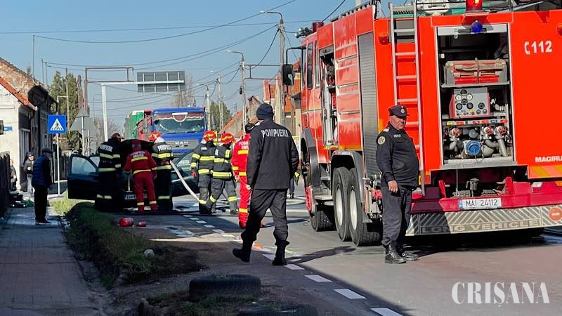 Un autoturism a luat foc în mers, marţi dimineaţa, pe o stradă din localitatea Aleșd, cel mai probabil din cauza unui scurtcircuit.