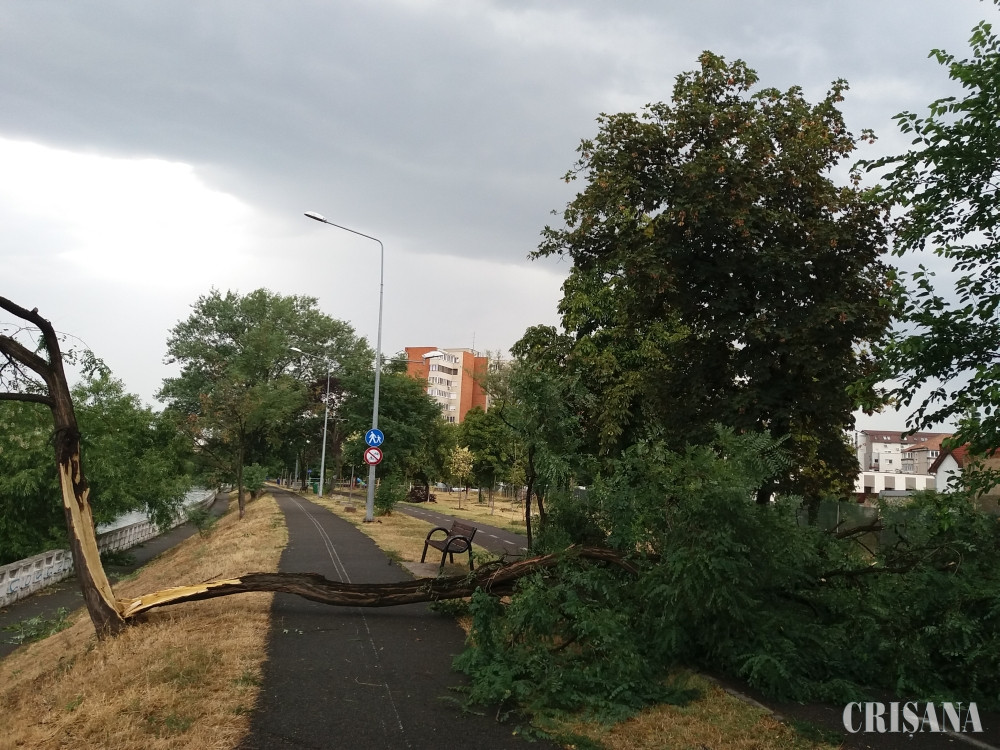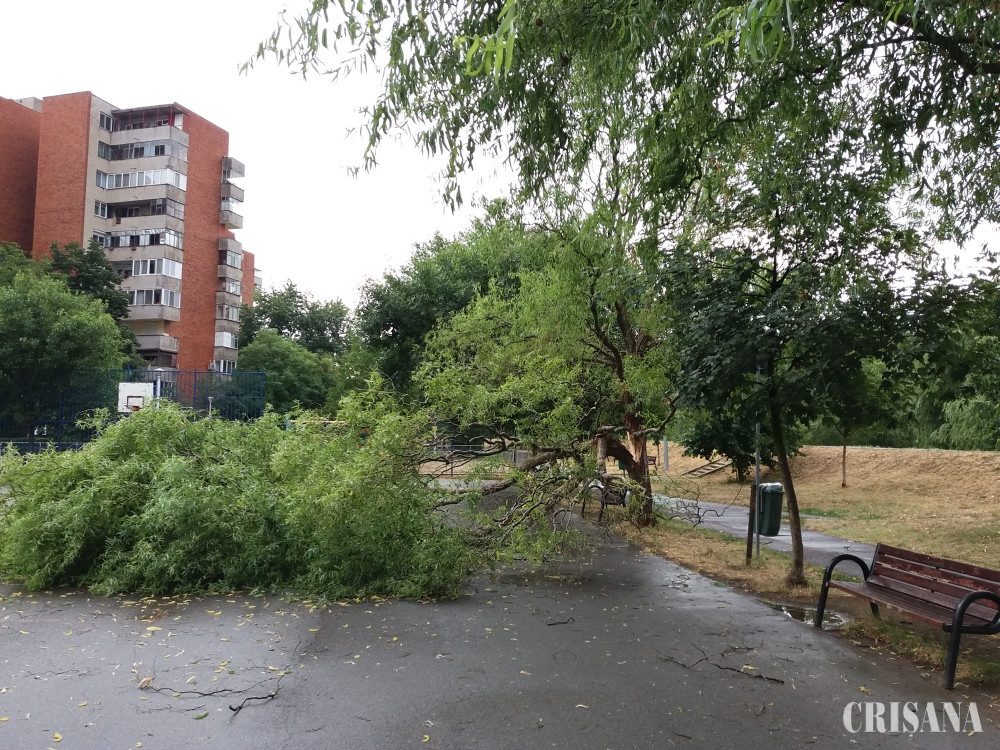 Pe strada Bistriței din Oradea vijelia de scurtă durată a pus la pământ un copac, acesta a căyut peste stradă blocând circulația. În scurt timp și/au făcut apariția echipajele de poliție și pompierii care au început să degajeye drumul. Pe malul Crişului repede vijelia a doborât mai mulţi copaci, blocând accesul pe aleile pentru pietoni şi biciclete. În Parcarea de lângă Podul Decebal furtuna a rupt crengi imense din copacii din apropiere - noroc că parcarea era aproape goală. Pe strada Corneliu Coposu vijelia a aruncat pe carosabil şi trotuar ţigle de pe câteva acoperişurile blocurilor.