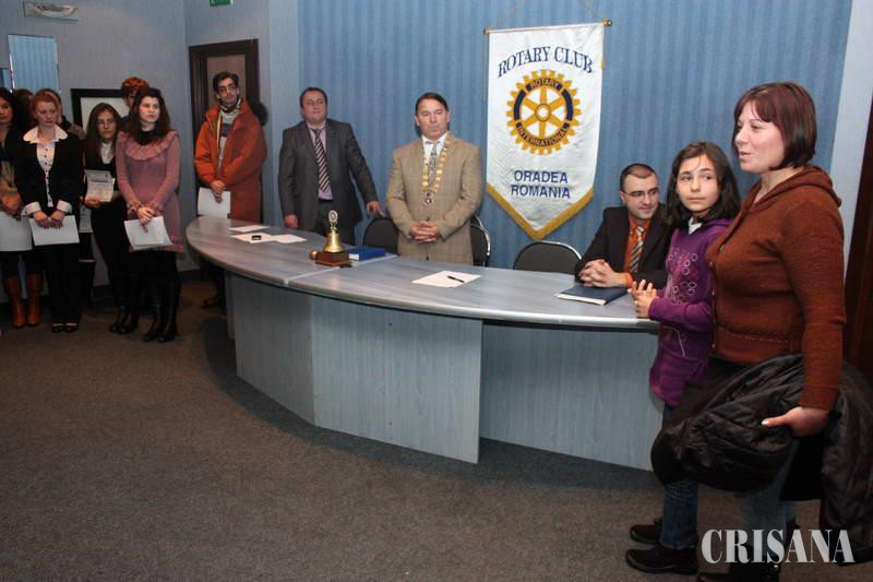 În fiecare an, Rotary Club Oradea recompensează elevii olimpici, oferind 15 premii a câte 1.000 de lei fiecare, în valoare totală de 15.000 lei. Acestea se adresează elevilor cu rezultate deosebite la olimpiadele şcolare, dar cu o situaţie materială precară. Alegerea elevilor care au beneficiat de premierea Rotary s-a realizat la recomandarea directorilor de şcoli şi licee din judeţ, precum şi pe baza diplomei primite de elevi în anul şcolar 2009-2010. "Pentru al cincilea an, am organizat premierea a 15 elevi orădeni cu merite deosebite la învăţătură. Poate sunt puţini, dar atât ne-am propus şi atât ne permitem deocamdată. Din acest an am decis ca premiul să poarte numele ziaristului Nicolae Şandru, fost membru al Clubului nostru, care a trecut în veşnicie anul trecut", a precizat Mihai Bulc, preşedintele Rotary Club. Aseară au fost premiaţii elevii care au reuşit, prin prezenţa lor la olimpiade sau alte concursuri şcolare, să aducă cinste învăţământului orădean. Premianţii serii au fost: Hora Codrin - Liceul Teoretic Emanuel, Roxana Urs - Liceul de Artă, Florina Ungur - Colegiul Naţional "Partenie Cosma", Dan Mercea şi Sebastian Trifa - Colegiul Naţional "Emanuil Gojdu", Nicoleta Maria Andrei - Colegiul Tehnic "Mihai Viteazul", Marinela Baciu - Liceul Teoretic "Aurel Lazăr", Andra Patricia Reştea - Colegiul Naţional "Mihai Eminescu", Adam Dudaş - Liceul Teoretic "Ady Endre", Paul Marius Gelu - Colegiul Economic "Partenie Cosma", Vlad Cezar Bogdan - Colegiul Tehnic "Constantin Brâncuşi", Gabriel Călugăriţa - Colegiul Tehnic "Dimitrie Leonida", Bianca Ţenţ - Liceul Teologic Penticostal Betel, Manuela Gavriş - Liceul Teologic Baptist şi Şcoala Tăşad, care, deşi nu are olimpici, va beneficia de o sumă de bani pentru a se schimba duşumeaua la o sală de clasă.