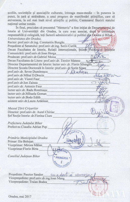 În final, precizăm că prezentul „Memoriu” a fost inițiat de Departamentul de Istorie al Universității din Oradea, la care s-au asociat, după o consultare responsabilă și colegială, toți factorii administrativi și politici din Oradea și Bihor.