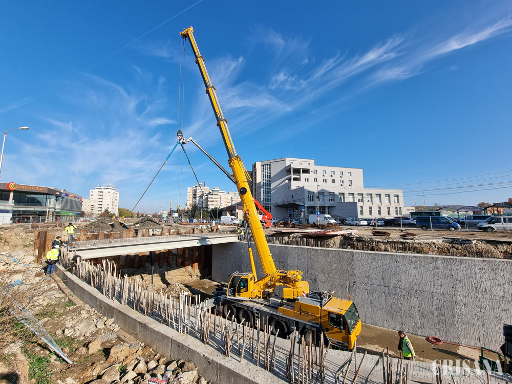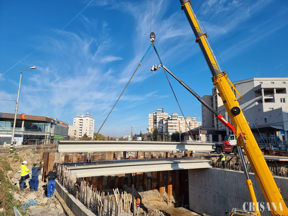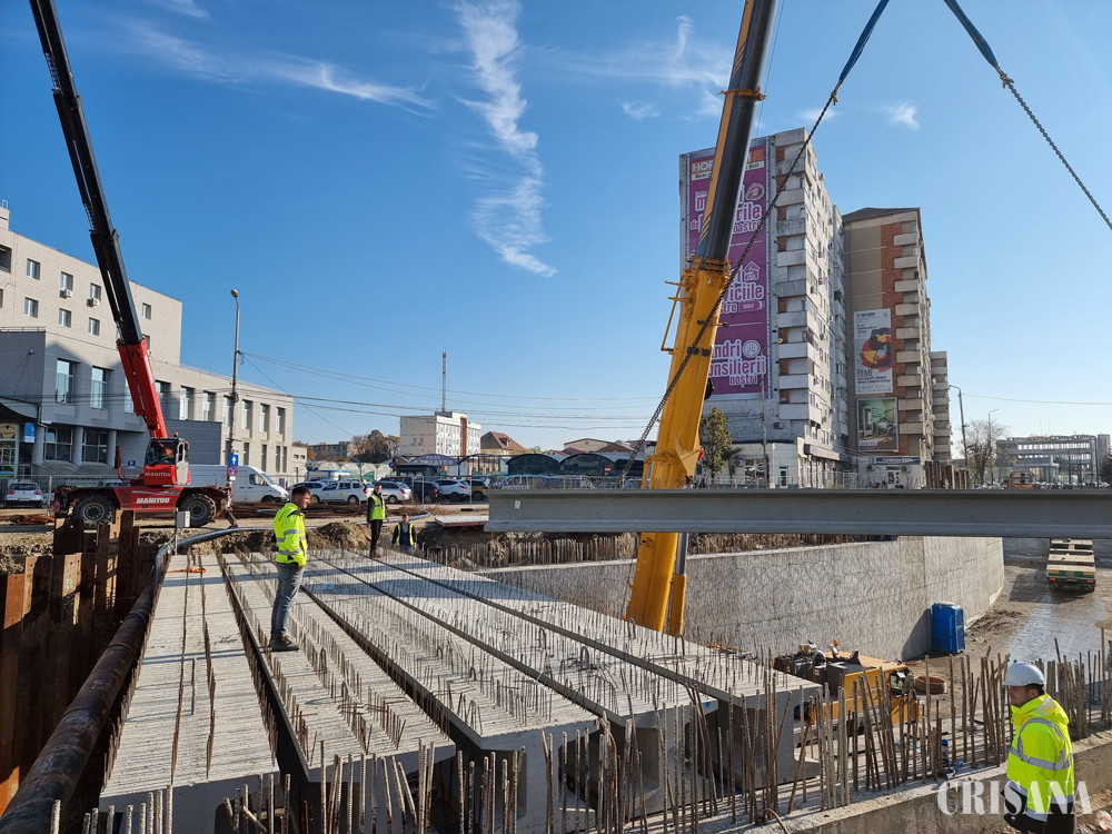 Primele 16 grinzi din cele 28 care vor fi montate la pasajul rutier din dreptul Pieței Cetate au fost livrate azi, astfel că a început montarea lor deasupra pasajului. Restul de 12 grinzi urmează să fie livrate săptămâna viitoare.