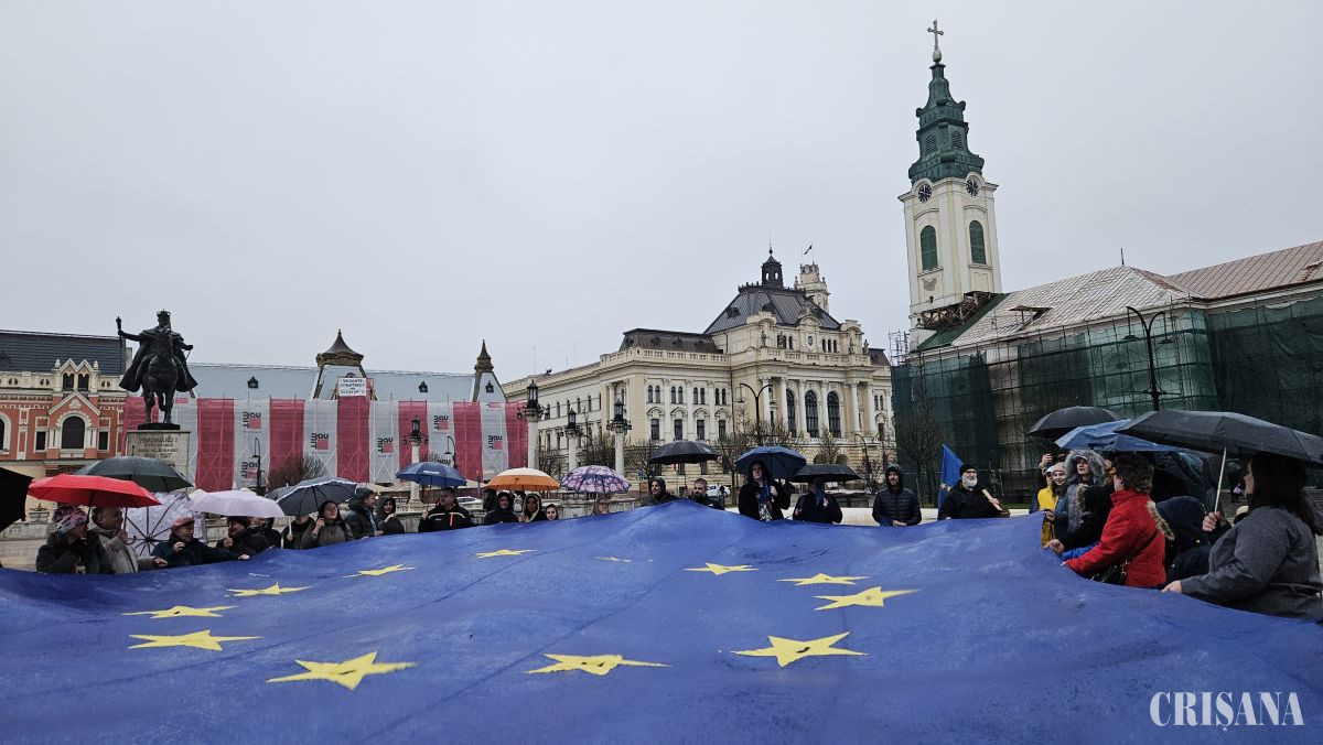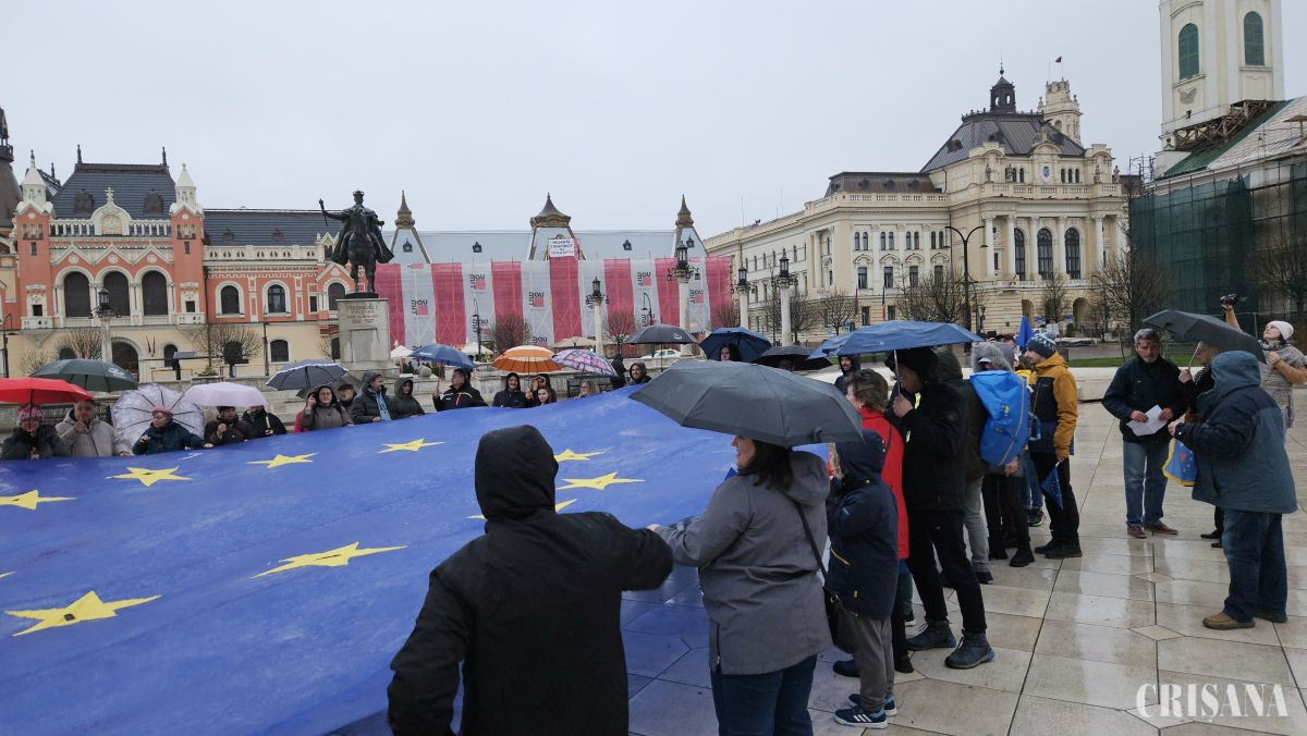 În jur de 100 de persoane au participat sâmbătă, 15 martie, în Piața Unirii, la un miting pro-democrație și pro-UE în ciuda ploii care, pe alocuri, a turnat cu găleata. Ascunși sub umbrele, participanții au desfășurat un steag al UE de mari dimensiuni, au glumit și au ascultat muzică.
