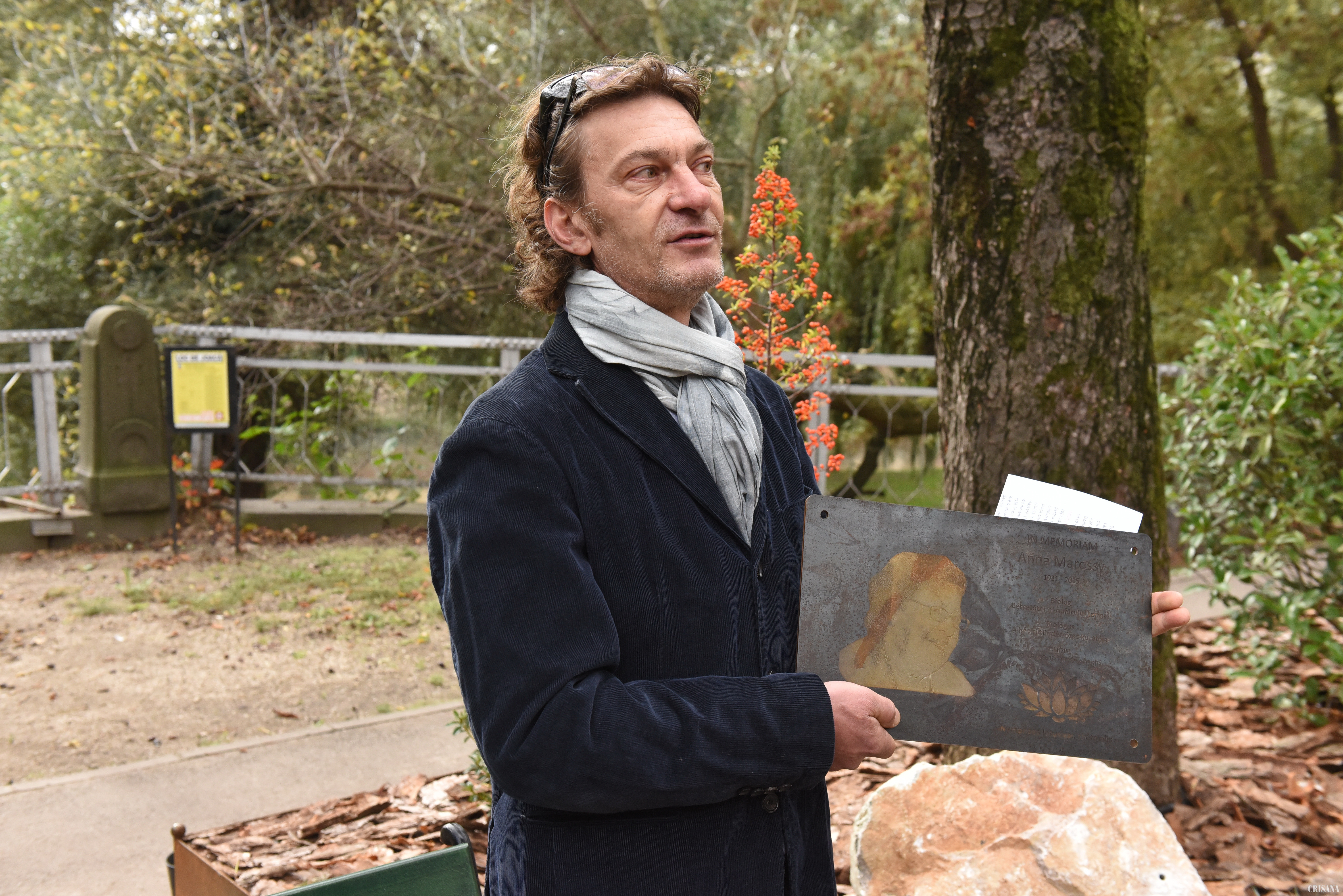 „Placa este din metal de tip corten, de dimenisuni nu foarte mari, gravată cu jet de apă. Credem că mărimea plăcii este în perfectă concordanță cu modestia pe care Anna Marossy a reușit s-o arate în timp, iar acest tip de metal pe care l-am ales are o proprietate interesantă: ruginește într-un mod original, astfel încât rugina devine elementul caracteristic, tot restul părând neatins. Poziționarea, oarecum, la sol, a soclului și plăcii îndeamnă pe cel interesat să facă o plecăciune pentru a descoperi obiectul, iar doamna Marossy merită din partea noastră această plecăciune (...) Se împlinesc cinci ani de la descoperirea celeilalte fețe a eternității de către doamna Anna Marossy, iar Societatea Carpatina Ardeleană se află, în acest moment, în Padiș, pentru a o comemora...”, a subliniat Cătălin Popa, președintele executiv al Fundației Comunitare Oradea, moderator al evenimentului.