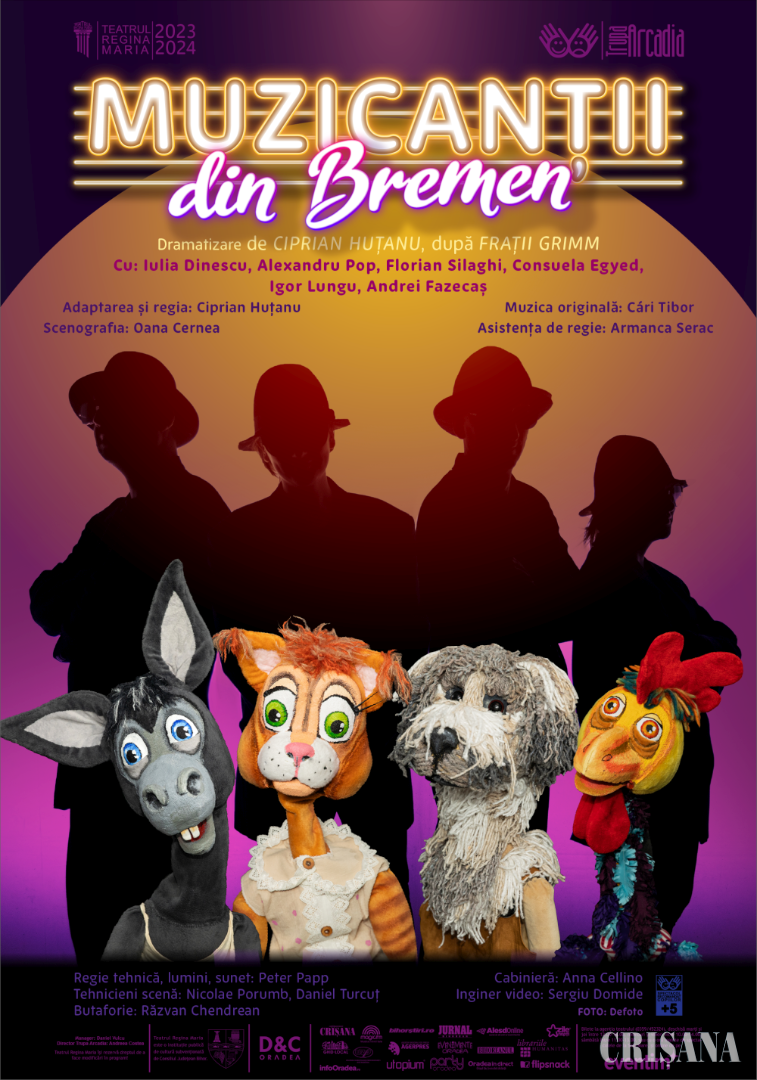 Trupa Arcadia a Teatrului Regina Maria se pregătește de premiera spectacolului „Muzicanții din Bremen”, adaptare după Frații Grimm, regia - Ciprian Huțanu. Premiera va avea loc duminică, 8 octombrie, de la ora 11.00, la Sala Arcadia.