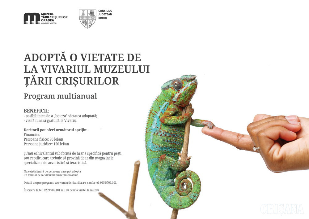 Muzeul Țării Crișurilor Oradea - Complex Muzeal invită orădenii să se implice şi în anul 2022 în programul Adoptă o vietate la Vivariu! Programul a debutat în noiembrie 2019 şi s-a bucurat de succes în rândul vizitatorilor care pot „năşi” un animal, pentru un an.