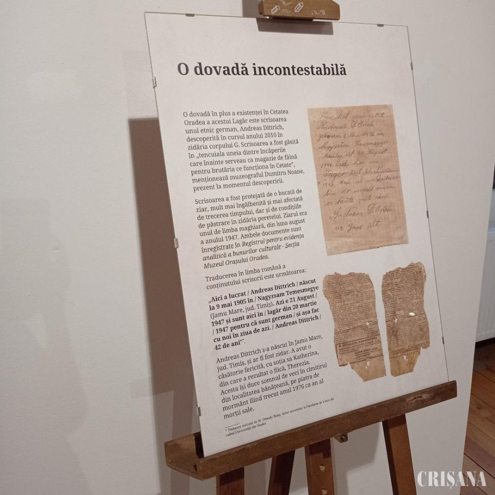 Totodată, publicul secției Muzeului Orașului Oradea poate vizita și expoziția „Locuri ale memoriei: Lagărul din Cetatea Oradea”. În cadrul expoziției este prezentată scrisoarea unui etnic german, Andreas Dittrich, descoperită în cursul anului 2010 în zidăria corpului G din Cetatea Oradea. Scrisoarea a fost protejată de o bucată de ziar de limba maghiară, din luna august a anului 1947.