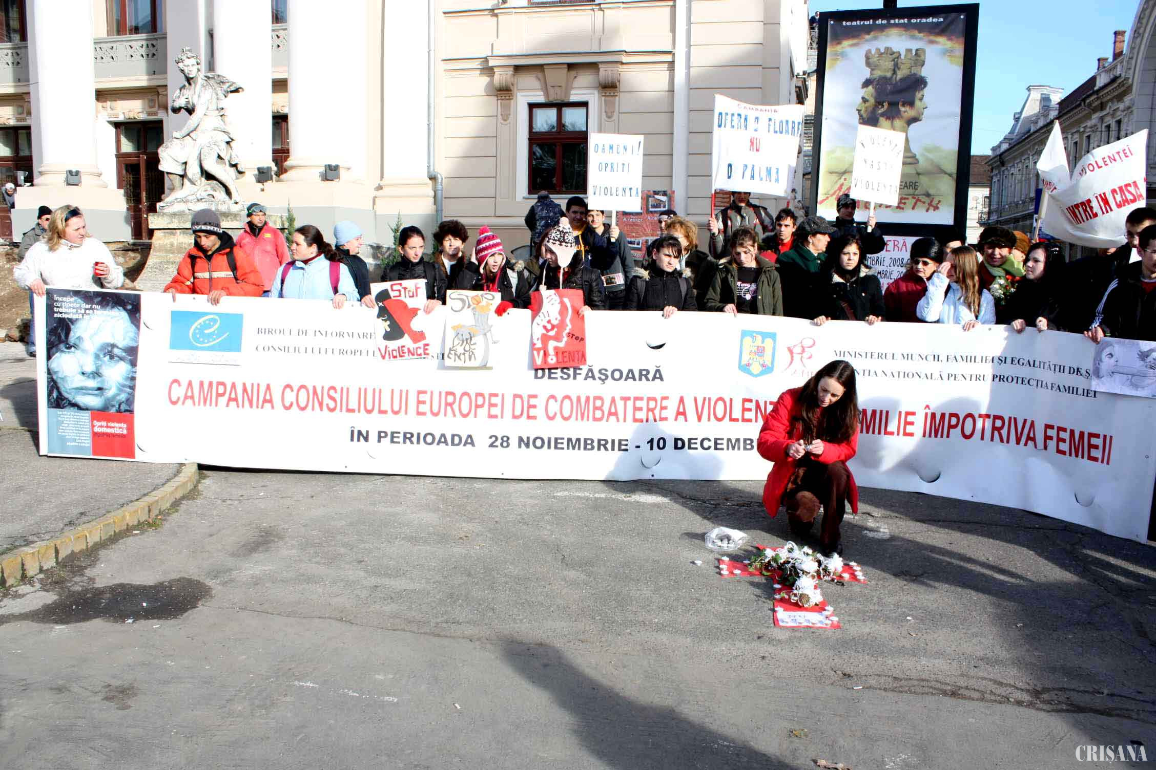 Campania de prevenire a violenţei intrafamiliale "Nu lăsa violenţa să intre în casa ta" a ajuns la final ieri, activităţile desfăşurate de la începutul lunii noiembrie încheindu-se cu un marş al tăcerii. Zeci de elevi cu pancarte şi afişe s-au adunat în faţa magazinului Crişul, de unde s-au deplasat, pe Corso, înspre Teatrul de Stat. Aici au aprins lumânări şi au ţinut un moment de reculegere în memoria victimelor violenţei în familie.