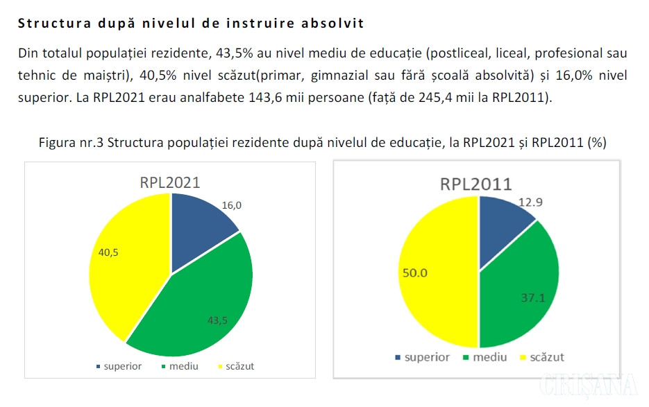 un nivel ridicat de educație în procent de 45,2% bărbați și 54,8% femei. Nivel mediu de educație au 52,5% persoane de sex masculin, respectiv 47,5% persoane de sex feminin, iar în ceea ce privește nivelul scăzut de educație, 45,6% sunt bărbați, iar 54,4% sunt femei”, menţionează Direcţia Judeţeană de Statistică Bihor.