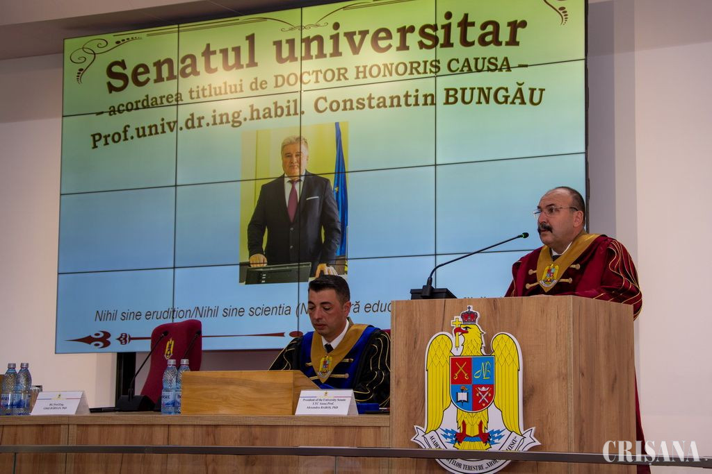 Constantin Bungău a primit înalta distincție academică pentru contribuțiile avute în domeniul său de expertiză, Inginerie și Management, și pentru managementul universitar aplicat în calitate de rector al Universității din Oradea.