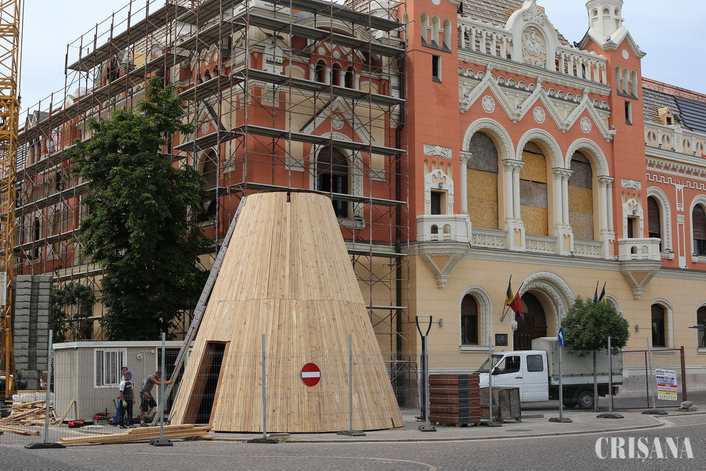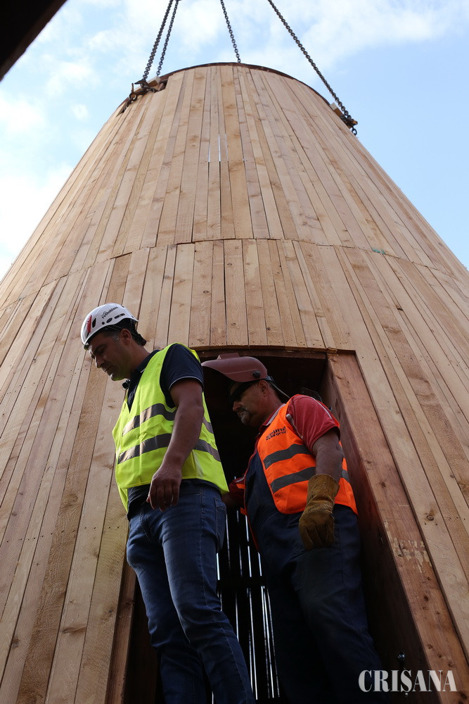 Urmează ca la sfârșitul acestei săptămâni să fie adusă pe șantierul din fața Palatului Episcopal și partea superioară a turlei, respectiv partea superioară a structurii de lemn montată ieri.