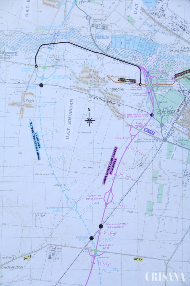 Potrivit lui Ilie Bolojan, traseul final propus se desprinde din drumul expres Oradea-Arad în zona km 31, care devine km 0 al variantei. Traseul variantei se desfășoară paralel cu (calea ferată) CF 328 Arad-Oradea și intersectează (drumul comunal) DC 80 la km 3+760 (cu pasaj pe acesta) și continuă până la km 5+900, unde supratraversează cu pod canalul existent și drumurile locale adiacente acestuia. În continuare, traseul are o orientare Nord-Est și traversează DC 77 la km 9+400 (cu pasaj pe acesta). La cererea autorităților locale, în această poziție s-a prevăzut amenajarea unui nod rutier pentru a se asigura conectivitatea în/din drumul expres al rețelei de drumuri prevăzute a se realiza în zonă (drumul de legătură Oradea-Nojorid, legătura la Aeroportul Oradea). După aproximativ 1 km de la DC 77, traseul traversează cu un pod calea ferată CF 328 (Oradea-Arad) și drumurile locale și continuă până la intersecția cu (drum judeţean) DJ 797 (Oradea-Sântandrei), unde se amenajează un seminod, pentru a se asigura relațiile dinspre A3 și spre Arad cu localitatea Sântandrei și zona de sud a municipiului Oradea. După traversarea DJ 797, se supratraversează cu un pasaj comun CF 334 (Oradea-Cheresig), un canal, pârâul Peța și drumuri locale.
