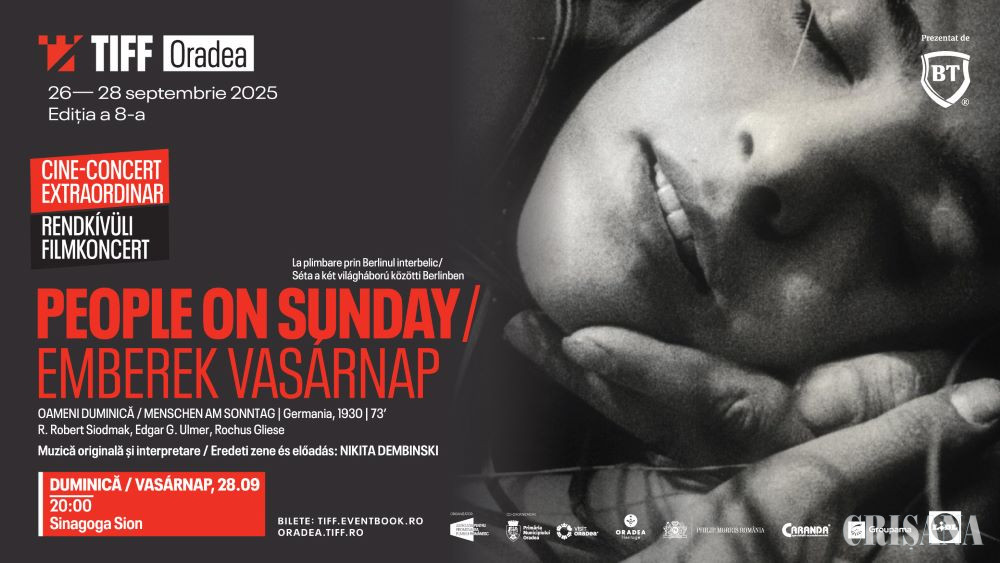Seria evenimentelor speciale va continua, duminică, 28 septembrie, ora 20.00, la Sinagoga Sion, cu filmul mut, „People on Sunday” (r. r. Robert Siodmak, Edgar G. Ulmer, Rochus Gliese), o veritabilă bijuterie a cinematografiei mondiale. Atmosfera va fi completată de muzica originală a lui Nikita Dembinski, recreată, în mare parte, cu synth-uri și pian electric, îmbogățită cu efecte speciale și multă improvizație.