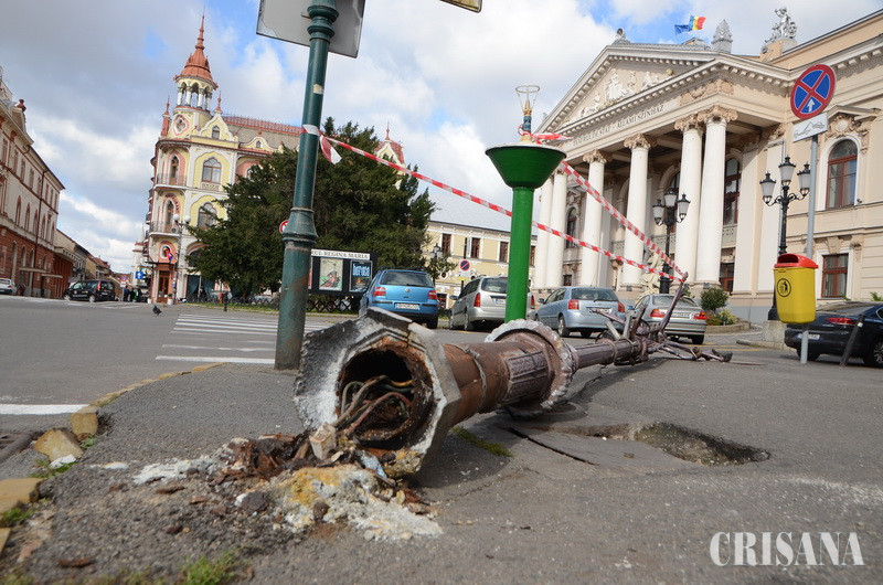 Un stâlp de iluminat aflat în stația de taxi de lângă Teatrul Regina Maria a fost pus la pământ, nu de vântul puternit care a suflat zilele acestea în Oradea, ci de un șofer de taxi neatent.