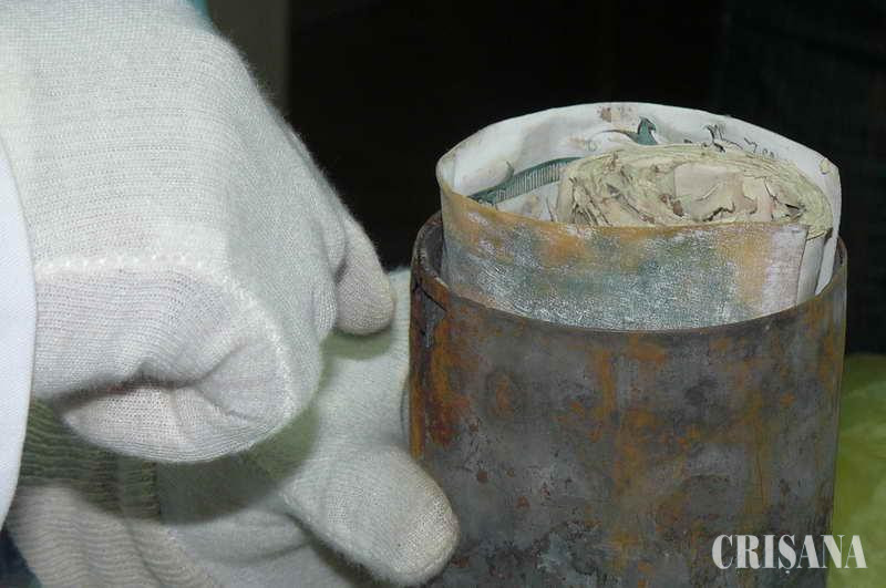 Directorul Muzeului Ţării Crişurilor, Aurel Chiriac, a precizat că din această cauză hârtia nu a fost scoasă din tubul metalic. "De sâmbătă, când a fost descoperit recipientul şi până luni, când ne-a fost predat, a stat în condiţii improprii. Totuşi, s-a văzut clar că în tub sunt două documente, scrise în limba maghiară, limba oficială din acea perioadă (n.r. - în anul 1900). Unul dintre documente este probabil un hrisov, în care se precizează ziua în care a început construcţia clădirii, cei care au construit, data la care s-a finalizat lucrarea. Celălat document este un caiet mai gros în care sunt trecute date despre donatori, donaţii şi cheltuielile care s-au făcut. Practic sunt date care ţin de prestigiul unei astfel de clădiri", ne-a declarat Chirac. Acesta a menţionat că în epoca modernă era obiceiul ca la temelia clădirilor importante să se pună astfel de documente. Deoarece documentele necesită o intervenţie de urgenţă în condiţii stricte într-un laborator de restaurare a hârtiei, directorul MŢC a precizat că a luat legătura cu colegii săi muzeografi de la Alba Iulia, unde există un astfel de laborator de specialitate.