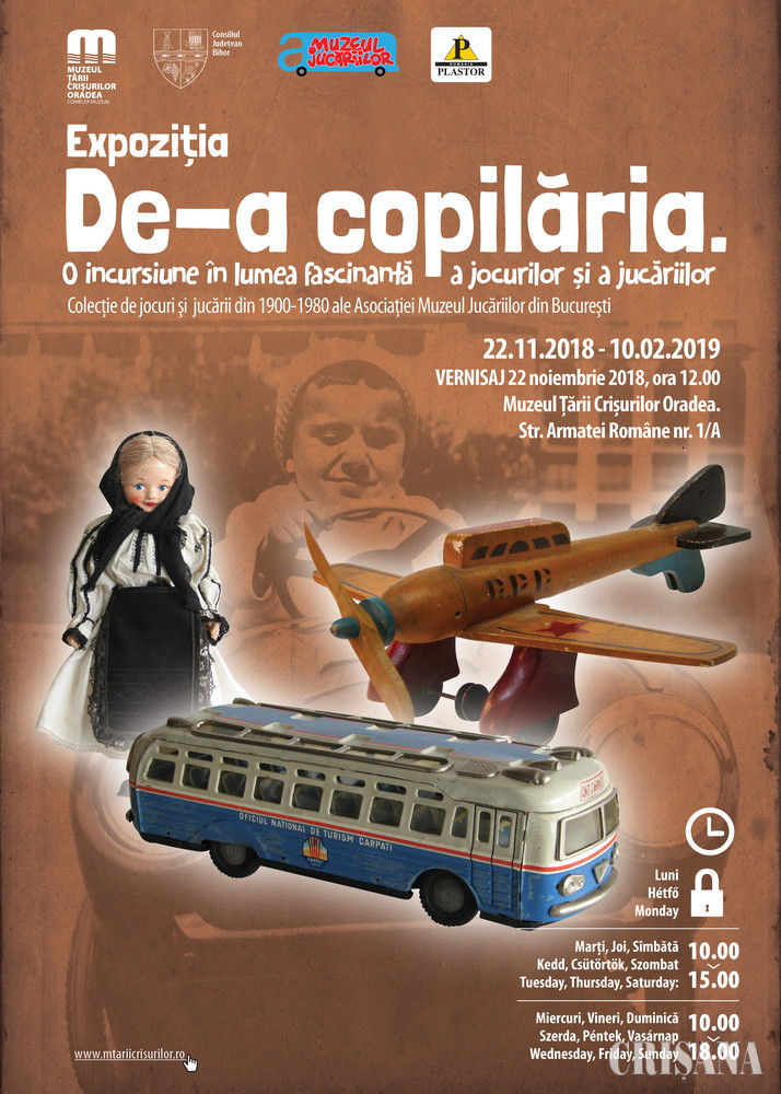 Expoziţia „De-a copilăria. O incursiune în lumea fascinantă a jocurilor şi a jucăriilor” este organizată în parteneriat cu Consiliul Judeţean Bihor, Asociaţia Muzeul Jucăriilor din Bucureşti şi Plastor SA Oradea. În cadrul expoziţiei este prezentată o selecţie de peste 600 de piese din colecţia Asociaţiei, care în decursul anilor a strâns peste 15.000 de jucării. Acestea au fost fabricate în România sau în alte ţări (Germania, Anglia, Japonia, China, Ungaria, SUA, fosta URSS), între anii 1900-1980 şi reprezintă jucăriile câtorva generaţii de copii din România. Păpuşi diverse, jucării reprezentând animale, trenuleţe electrice, maşinuţe, trotinete din lemn, căluţ-balansoar, cărucioare de păpuşi, găletuşe de plajă, jocuri de societate - „Păcălici”, „Şah şi moară”, „Telefonul” -, avioane, tancuri etc., toate aceste jucării şi jocuri au povestea lor, „fiecare jucărie a fost martora unei emoţii, a unei lacrimi sau a unui vis împlinit şi (...) absolut toate jucăriile (...) au fost martorele unui zâmbet”. De asemenea, în această expoziţie vor fi expuse jucării fabricate la fabrica de jucării „Viitorul” (în prezent Plastor SA), cea mai mare fabrică de jucării din ţară după naţionalizarea sa şi până în 1990.