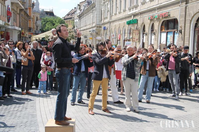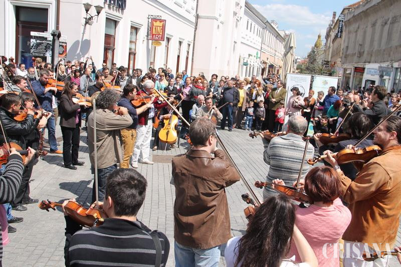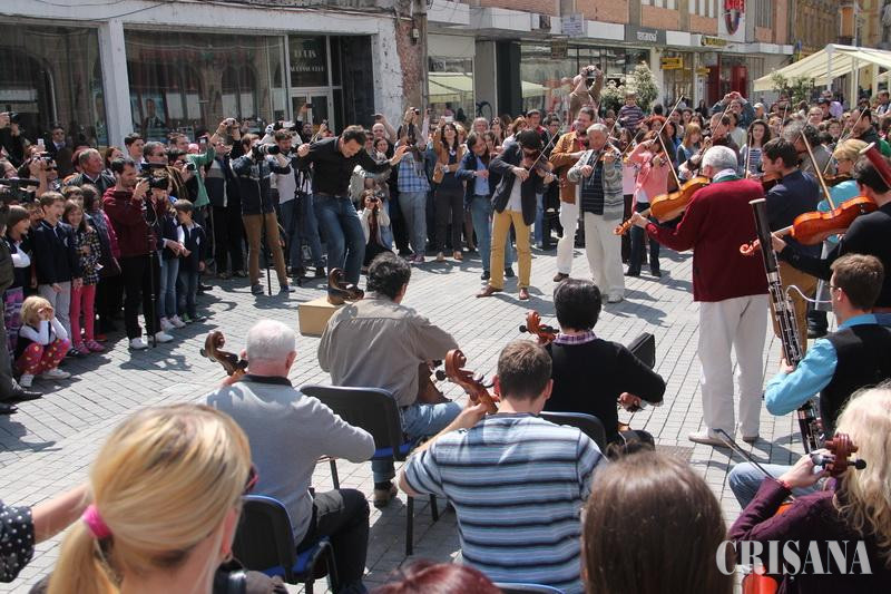 Un eveniment inedit a reuşit, ieri, în miezul zilei, să-i facă pe orădenii aflaţi în trecere pe pietonalul din Oradea să se oprească în loc, timp de cinci minute, şi să se bucure de savoarea muzicii clasice oferită de Filarmonica de Stat din Oradea.