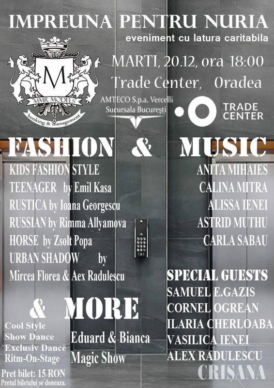 Fashion stylistul Marius Molan și Agenția de modele MModels România organizează evenimentul cu latură caritabilă “Împreună pentru Nuria”, un concept fashion, music and more, care va avea loc marți, 20 decembrie 2016, la Trade Center, de la ora 18.00. Contravaloarea biletelor va fi donată în totalitate micuței Nuria Maria Țărmure, o fetiță de numai 8 ani, diagnosticată cu hidrocefalie, retard locomotor sever, ce urmează să fie supusă zilele acestea unei noi intervenții chirurgicale la Cluj.
