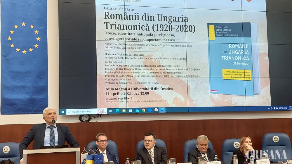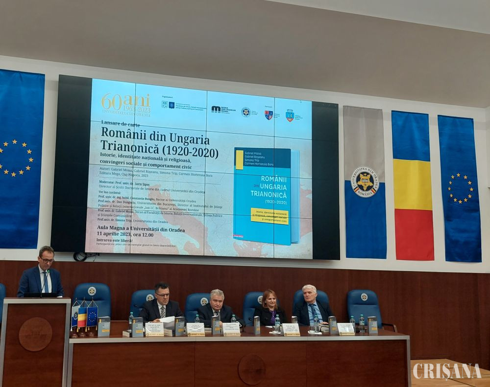 Aula Magna a Universității din Oradea a găzduit, zilele trecute, lansarea cărții „Românii din Ungaria Trianonică (1920-2020)” - Istorie, identitate națională și religioasă, convingeri sociale și comportament civic”, scrisă de Gabriel Moisa, Gabriel Roșeanu, Simona Trip și Carmen Hortensia Bora, apărută la Editura Mega, Cluj-Napoca, 2023.