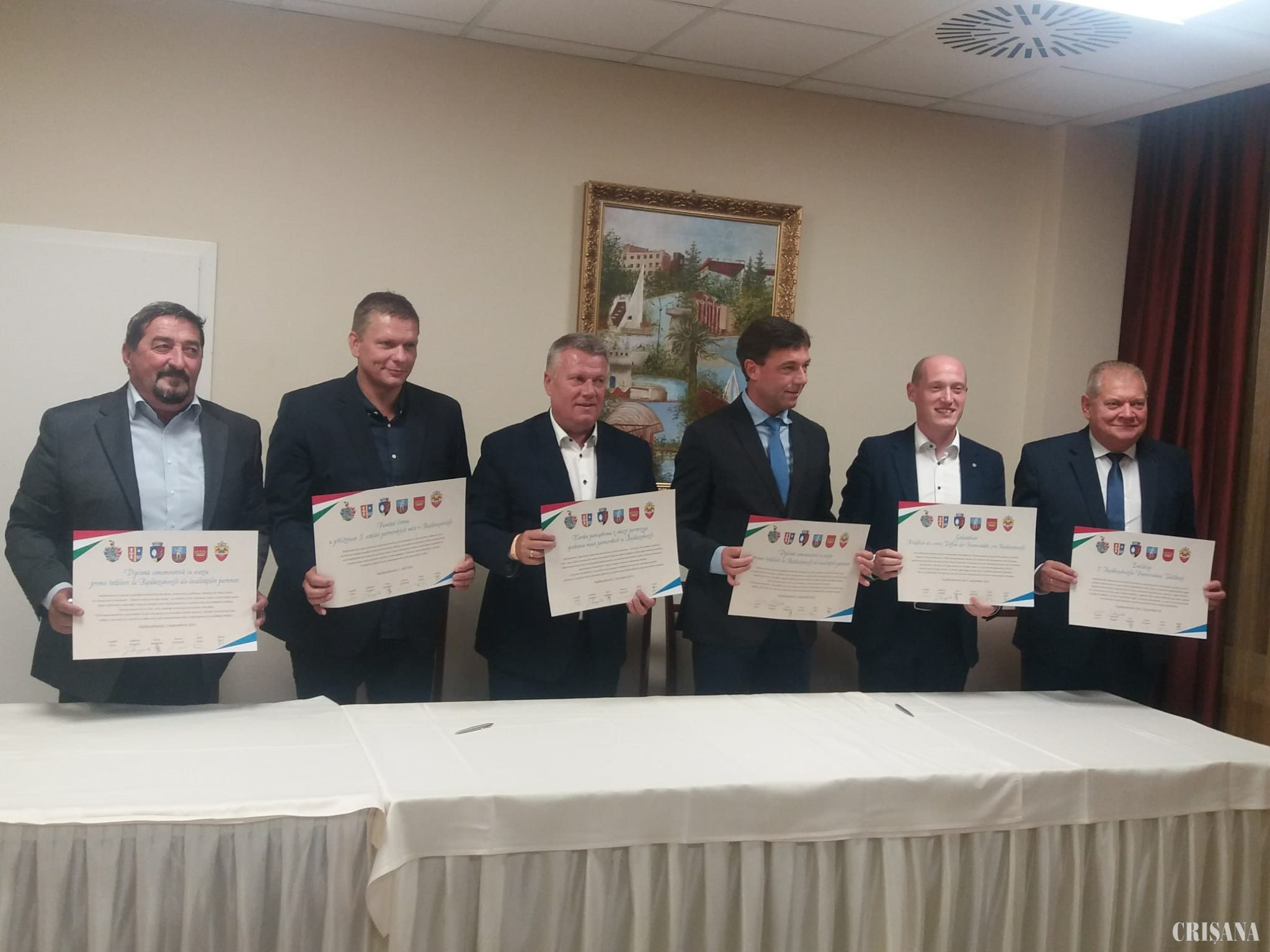 Seara, în cadrul mesei festive primarii delegațiilor prezente au semnat un act de colaborare, cu ocazia „I. Întâlniri la Hajduszoboszló ale localităților partenere” cu următorul conținut: „Hajdúszoboszló, precum localitățile înfrățite Bad Dürrheim, Dzierzoniów, Lanskroun, Târnăveni și Vadu Crișului, cu ocazia acestui eveniment au hotărât ca și în continuare doresc ca să întrețină aceste relații solide între comunități; întărirea relațiilor între Hajdúszoboszló și consiliile locale ale localităților înfrățite, între persoanele fizice, ONG- rile, bazându-se pe respectul reciproc între părți. În favoarea membrilor comunităților locale vom sprijini în continuare vizitele reciproce, schimbul de informații între cetățeni, care toate vor contribui la adâncirea și păstrarea prieteniei între Hajdúszoboszló și localitățile înfrățite”.