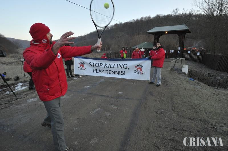 Primul care a ajuns cu automobilul în faţa pancartei a fost omul de afaceri Elan Schwartzenberg. Acesta a aşteptat siderat câteva minute cu motorul pornit, neştiind exact ce să facă. Între timp, jurnaliştii se apropiaseră de geam solicitându-i un punct de vedere. Situaţia a fost rezolvată de unul dintre bodyguarzii de la poarta domeniului, care la început l-a îmbrâncit pe unul dintre cei doi protestatari care ţinea pancarta cerându-i să se dea la o parte, apoi l-a luat în braţe pentru a elibera trecerea. „Mesajul nostru este foarte clar. Dorim ca domnul Ţiriac să oprească această vânătoare. Colegii mei au venit din Germania, Austria, Olanda şi Anglia pentru a protesta împotriva acestui masacru. Vrem să-i oferim domnului Ţiriac o alternativă la ceea se întâmplă pe acest domeniu. Până acum aici s-au ucis 1.400 de animale şi vrem să-i sugerăm domnului Ţiriac să joace mai mult tenis pentru că este un joc cu mai mult fair play şi nu omoară vieţi", a spus Veronica Tulpan, coordonatorul la nivel naţional al Fundaţiei Vier Pfoten care l-a invitat pe Ion Ţiriac să vină în faţa domeniul la o partidă de tenis. Activiştii au trasat apoi un teren în jurul pancardei şi au jucat câteva mingi, multe dintre ele ajungând pe domeniul de la Balc.