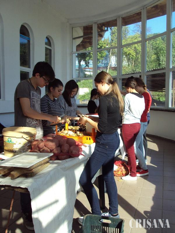 O zi mai târziu, copiii au ales să petreacă o dimineaţă caritativă cu scopul de a da o mână de ajutor măicuţelor în pregătirea şi servirea mesei de amiază pentru oamenii care, din diferite motive, au ajuns în situaţia de a nu avea posibilitatea să-şi asigure pâinea zilnică, la Mănăstirea "Sfintei Cruci". Stareţa mănăstirii, Maica Mina, i-a primit pe elevi cu mult drag şi i-a invitat să mai vină şi cu alte ocazii. Tinerii, împreună cu profesorii coordonatori, au curăţat cartofi, ceapă, morcovi, păstârnac, ţelină, gulii şi au sortat fructe şi legume. După terminarea activităţii, voluntarii au fost invitaţi să servească prânzul în trapezul mănăstirii.
