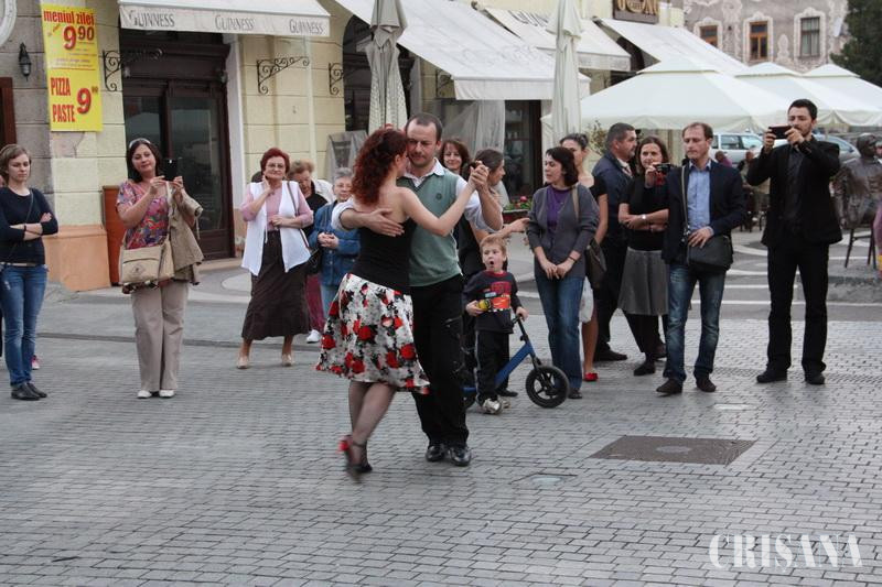 Instructorii Csontos Katalin și Szeghalmi Endre au ales un mod inedit de a sublinia începerea unor noi cursuri de dans la Moszkva Cafe. Le-au arătat oamenilor, pe viu, pe strada Republicii, cum arată un tango argentinian, în cadrul unui flash mob spectaculos. Orădenii care au trecut vineri, în jurul orei 18.20, pe strada Republicii au avut o mare surpriză. Acompaniați de un violonist și un interpret la acordeon, pe ritmurile vii și antrenante de tango, doi orădeni au început brusc să danseze. Nu a durat foarte mult până când aproape toată porțiunea de stradă din fața statuii poeților maghiari s-a umplut de curoși. Flash mob-ul a făcut parte dintr-o strategie de promovare a unor cursuri de dans care au început sâmbătă, 26 octombrie și se vor desfășura în sala de concerte a Moszkva Cafe.