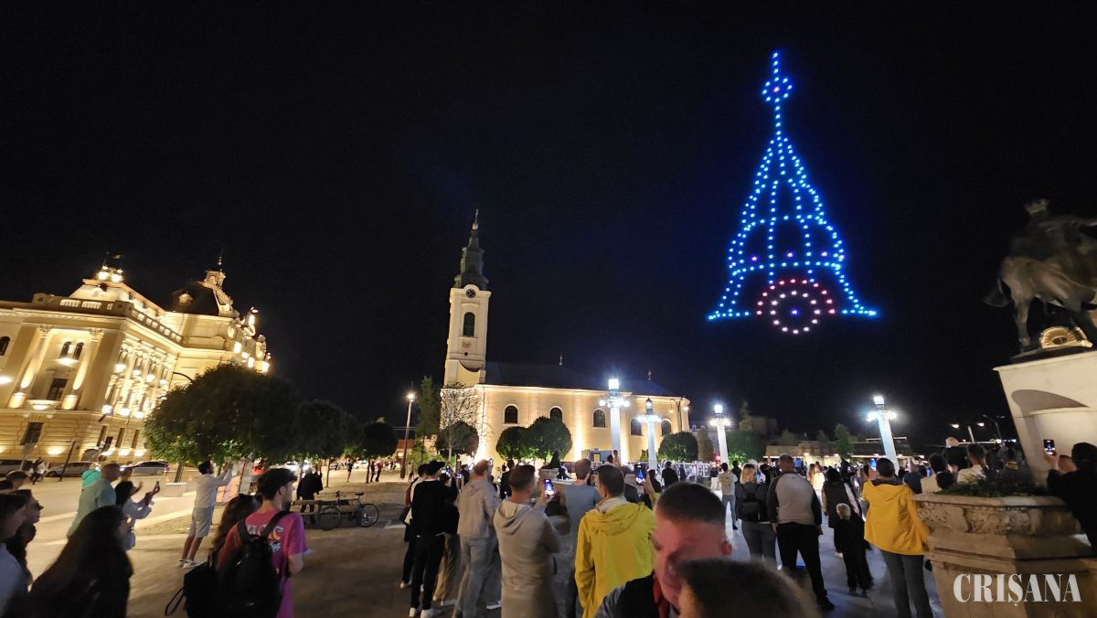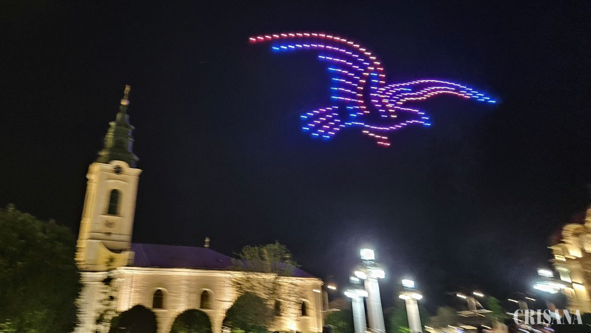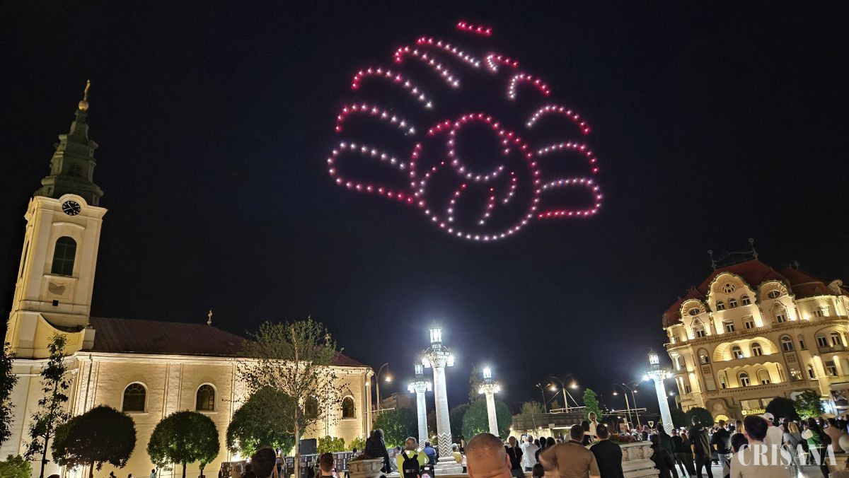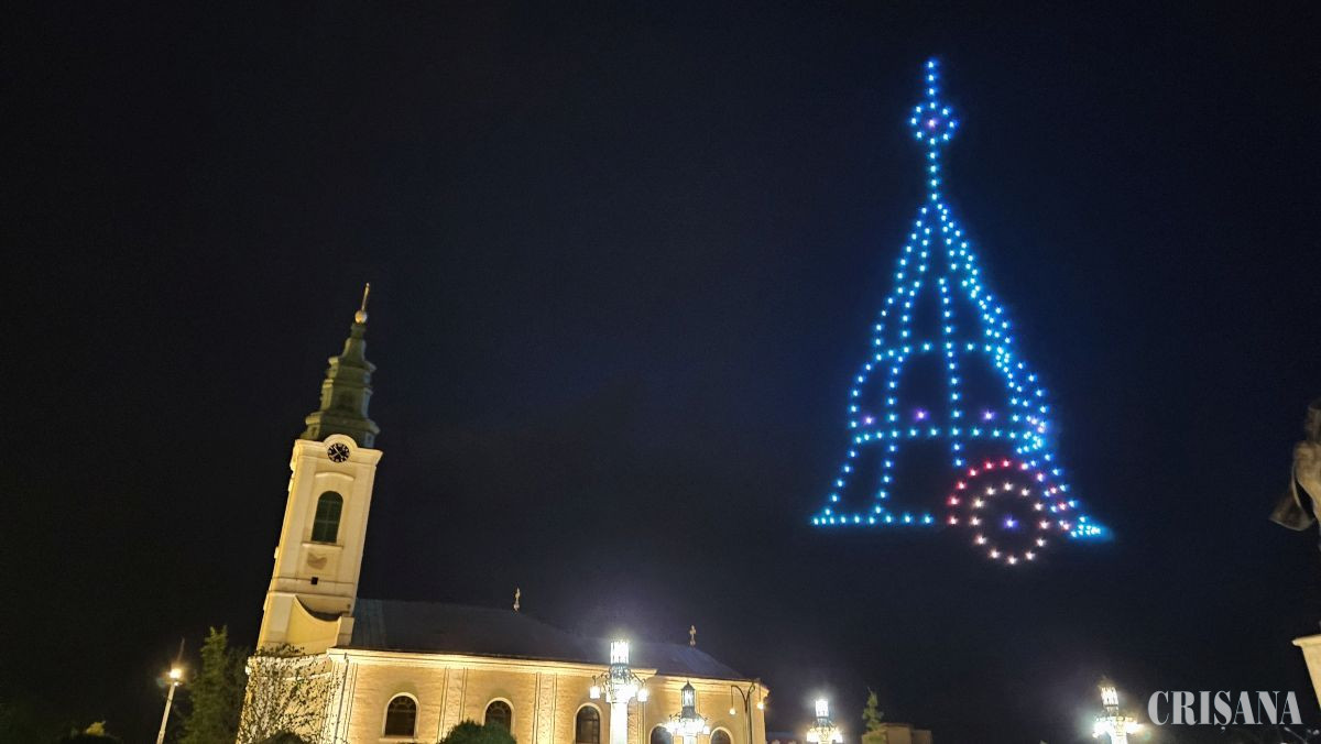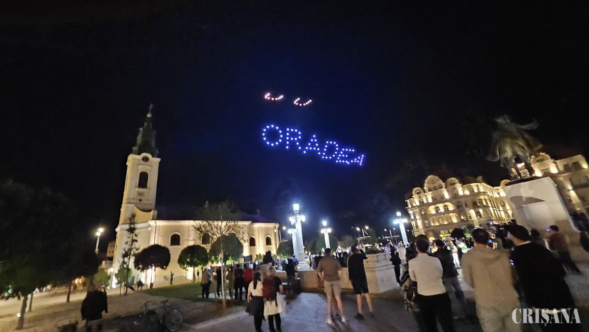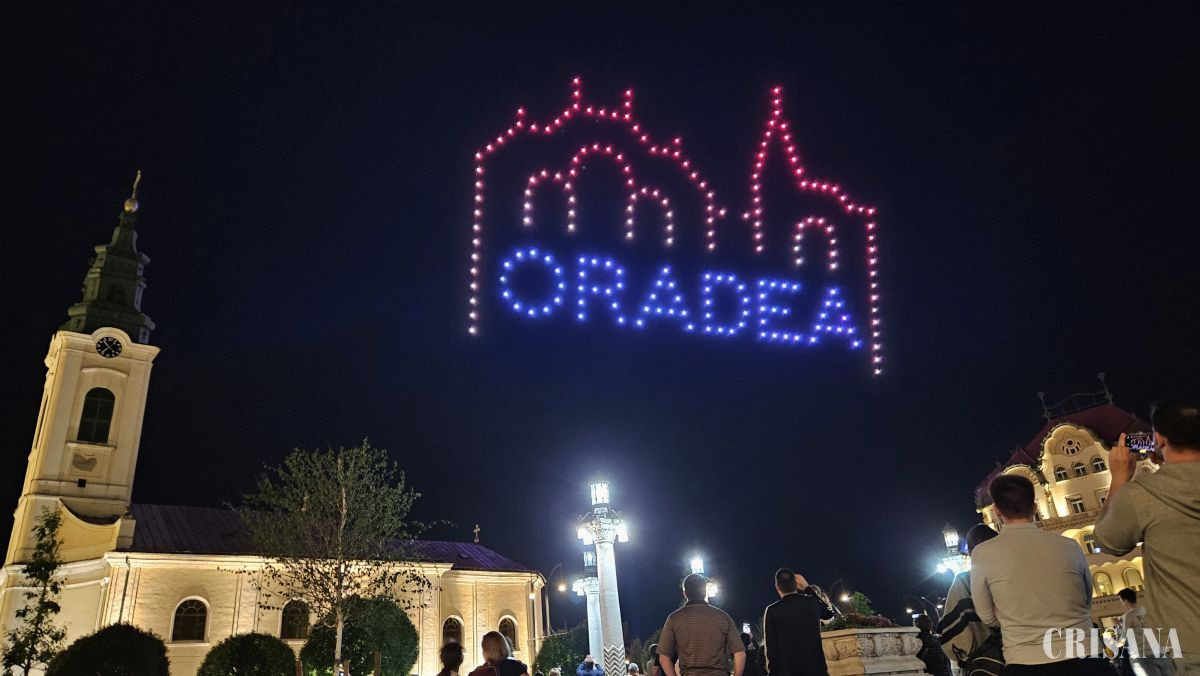 Mămici și bunici cu micuții de mână sau tătici cu copiii pe umeri, au asistat sâmbătă seară la un show cum nu a mai fost niciodată în Oradea. 200 de drone, în diverse culori, s-au aliniat deasupra Pieței Unirii scriind pe cer fie „Oradea” sau „Oradea Heritage”, fie desenând diferite forme specifice orașului și arhitecturii Art Nouveau. Impresionante au fost atât mișcările dronelor, unele în 3 D, cât și luminile care se plimbau și își schimbau culoarea de la o dronă la alta în paternuri care mai de care mai surprinzătoare. Show-ul a fost oferit de Evsky Show, prima companie din România care organizează spectacole aeriene cu drone luminoase.