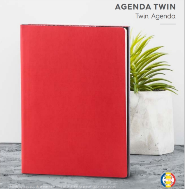 Twin este o agenda super moderna, flexibila, cu dubla deschidere pe orizontala fata-verso. Si surpriza este dubla utilitate a blocurilor: bloc datat saptamanal si bloc nedatat. Disponibila in 6 culori vesele de tip pastel, agenda este potrivita pentru un 2021 spontan si atipic. In plus aceasta agenda poate fi personalizata cu timbru sec, UV și chiar etichetă de rășină, una dintre cele mai noi metode de branding folosite în special pentru marele avantaj de a comunica complet și corect culorile logoului dumneavoastră, chiar și policromie. Agenda este disponibila aici: agende UNIKA.