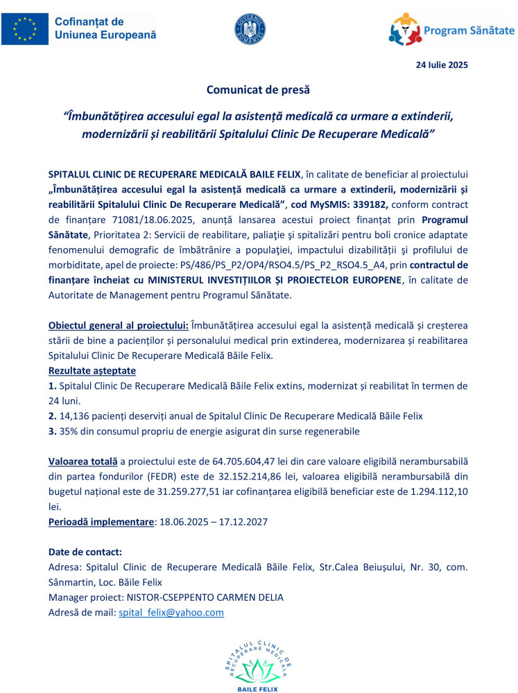 Comunicat de presă al Spitalului de Recuperare Medicală Băile Felix 24 Iulie 2025 163 1 0 Advertorial