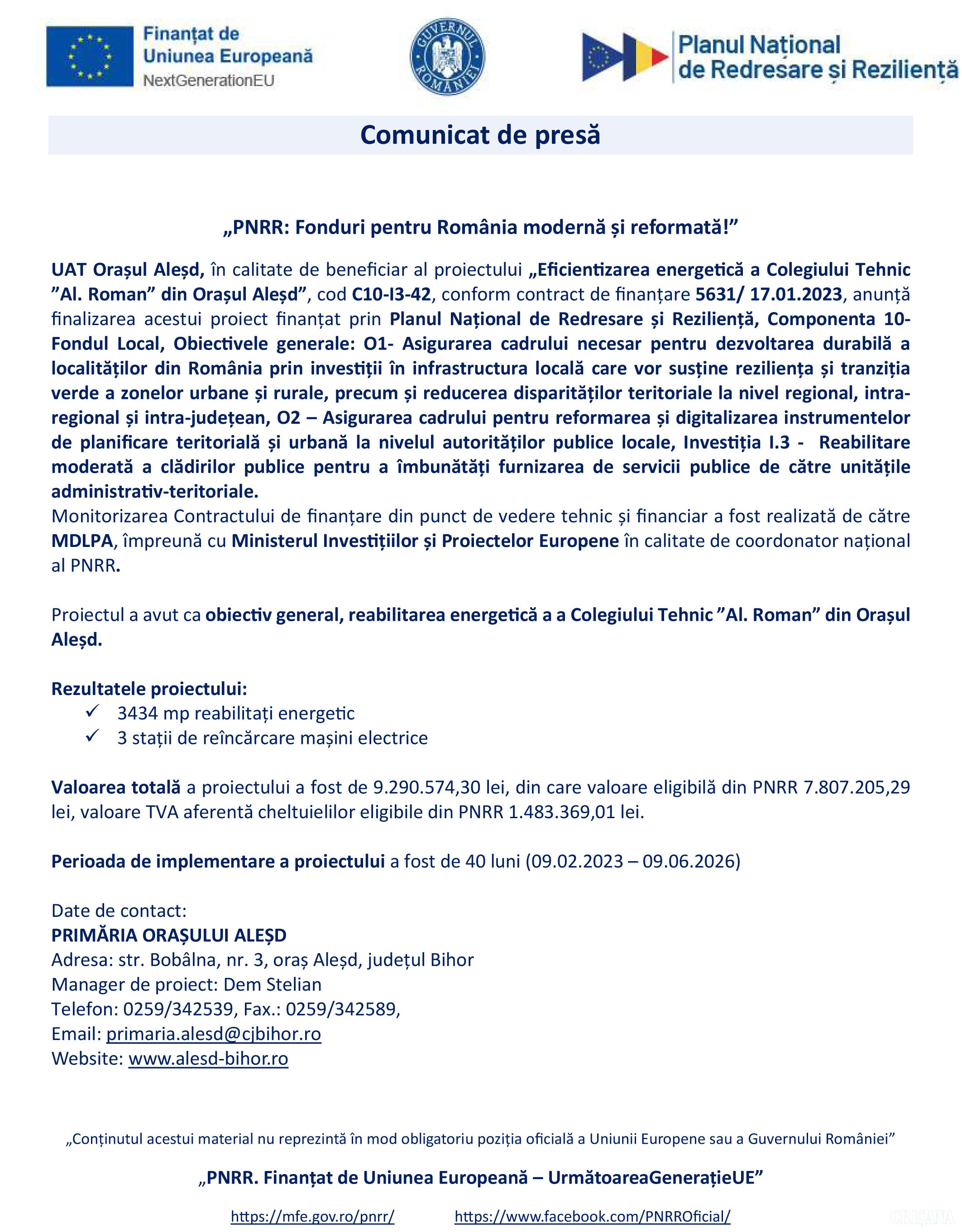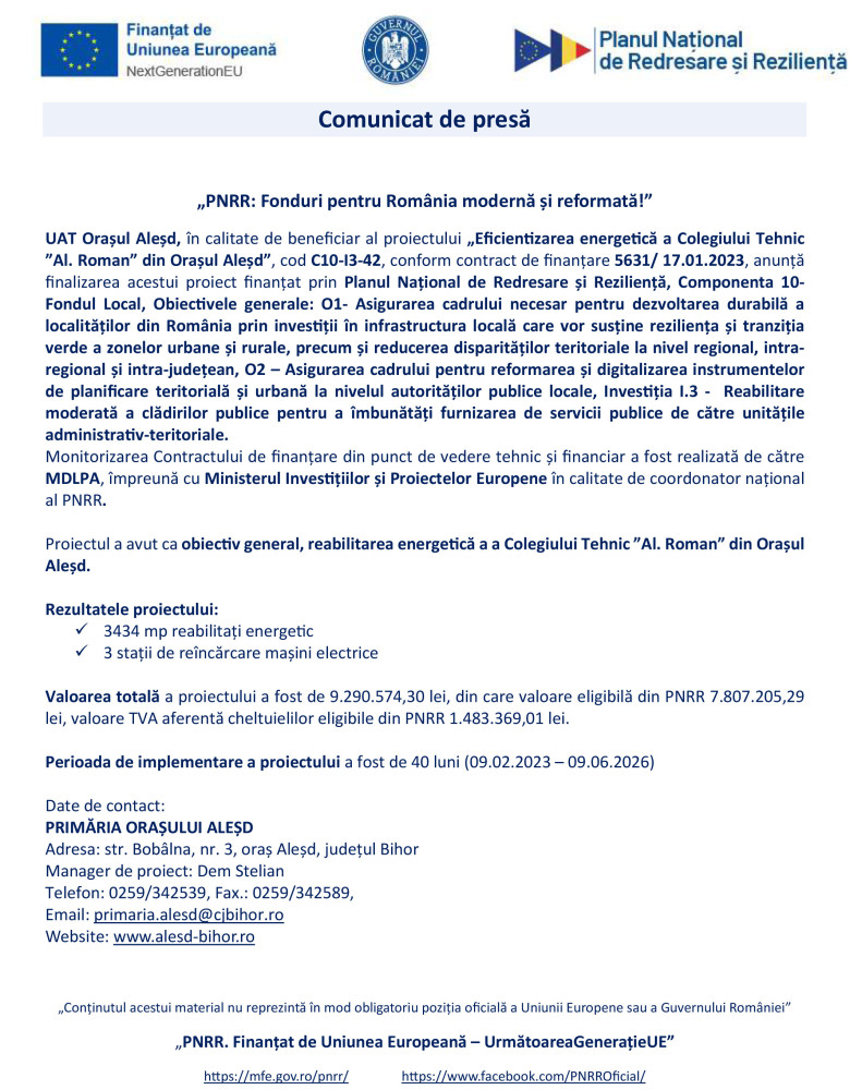 Comunicat de presă al UAT Aleșd, finalizare proiect CT Al. Roman 05 Februarie 2026 49 1 0 Advertorial