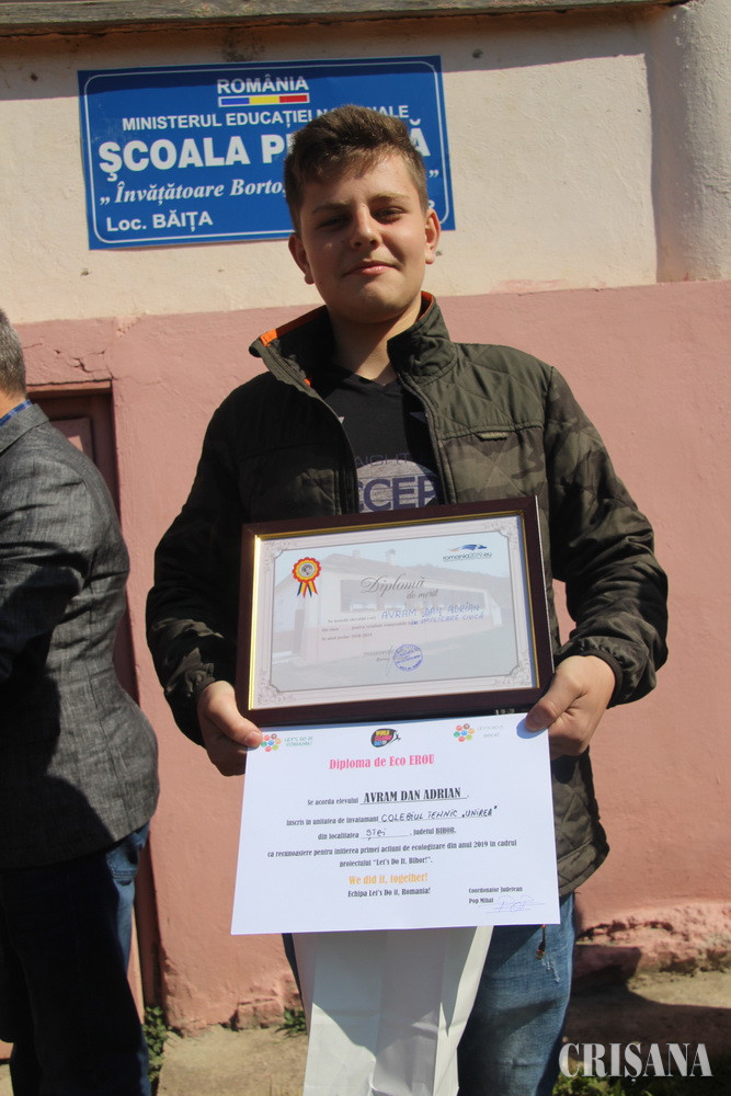 O nouă inițiativă, pe lângă multe altele derulate în ultima perioadă la școala din Băița de Asociația „Înv. Bortoș Costea Maria”, a prins viață, vineri, 19 aprilie, când iepurașul a sosit, mai devreme, cu multe cadouri pentru elevii și preșcolarii care învață în această instituție de învățământ, structură a Școlii Gimnaziale Nr.1 Nucet, al cărei director este prof. Traian Coraș. O zi splendidă, din toate punctele de vedere, au trăit micii elevi și preșcolari, în care și soarele, deosebit de strălucitor, a dorit să fie „martorul” fericirii micilor beneficiari ai unor cadouri aduse de „iepurilă”, așa cum îl alinta un mic preșcolar, tocmai înaintea vacanței Sărbătorilor Pascale. „Dăruind vei dobândi” este numele proiectului prin care Asociația „Înv. Borotoș Costea Maria” a oferit pungi pline cu dulciuri celor care frecventează școala din Băița, dar a și premiat nouă elevi liceeni care la începutul primăverii, mai precis în primele zile ale lunii martie, au inițiat o acțiune de strângere a gunoaielor de pe malul Crișului Băița, în care reacția localnicilor nu a întârziat să apară, deoarece aceștia le-au dat o mână de ajutor. „La una dintre întâlnirile cu voi, vă aduceam un model în persoana unei tinere localnice, acum doctor în știiințe, iar acum vin cu alt exemplu demn de laudă. Prin acești elevi, tânara generație aduce un suflu nou și ne arată că nu este totul pierdut”, a spus elevilor colonel (r) Nicolae Bortoș, ținând să evidențieze spiritul civic și inițiativa acestor tineri din comunitate - Adrian Dan Avram, Andreea Dana Avram, George Stan, Diana Culda, Radu Pele, Gabriel Bîlc, Antonio Covaciu, Crina Lăzău, Vlăduț Todea - care, așa cum ei au afirmat, au început primăvara cu o curățenie generală, un lucru mic pentru comunitatea noastră, dar un exemplu mare pentru consăteni. Din partea Asociației „Înv. Bortoș Costea Maria” acești merituoși elevi au primit o pungă plină cu cadouri, printre care s-au regăsit și tricouri inscripționate cu numele asociației, dar și o „Diplomă de Merit” - pentru rezultate remarcabile de implicare civică în anul școlar 2018-2019. „Acești tineri sunt rodul educației primite în familie, dar și în școală, fiind o mândrie pentru familie, școală și comunitate”, a afirmat Mihai Pop, reprezentantul Let’s Do It, România! pe județul Bihor, prezent la eveniment, evidențiind că exemplul acestor tineri a fost urmat nu doar de membrii unor comunități din Bihor, ci și din țară. Sub egida Let’s Do It, comunități din toată țara au început o amplă curățenie, urmând exemplul acestor tineri cărora le-a înmânat câte o „Diplomă de Eco Erou - ca o recunoaștere pentru inițierea primei acțiuni de ecologizare din anul 2019 în cadrul proiectului Let’s Do It, Bihor”. Președintele Asociației „Înv. Bortoș Costea Maria”, colonel (r) Nicolae Bortoș, a promis elevilor că vor fi invitații asociației pentru o zi în municipiul Oradea, unde vor beneficia de multe surprize plăcute, iar Mihai Pop s-a raliat acestei idei, domnia sa promițându-le vizionarea unui film în acea zi. Alături de învățătoarele Carla Petruse și Mihaela Mocan, la acest adevărat eveniment din viața școlarilor băițeni au participat și primarul Mircea Tuduce, însoțit de consilierul local Dan Blaga, împreună cu prof. Trian Coraș, directorul Școlii Gimnaziale Nr. 1 Nucet, care, în alocuțiunile lor, au felicitat inițiativa elevilor, dar le-au și promis sprijin în viitoarele lor acțiuni, unde vor fi siguri că vor fi angrenați mult mai mulți colegi de-ai lor, dar și alți locuitori de pe aceste minunate meleaguri.
