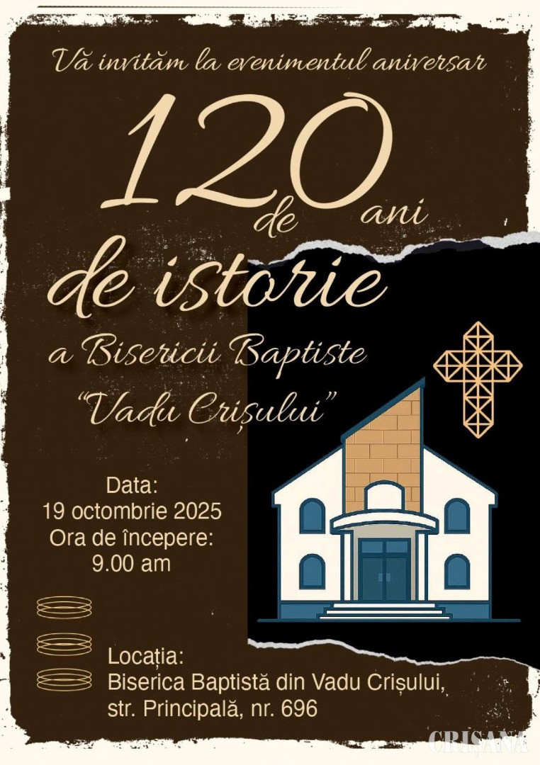 Evenimentul dedicat celebrării celor 120 ani de mărturie baptistă în Vadu Crişului va avea loc în data de 19 octombrie, începând cu ora 9.00, la Biserica Creștină Baptistă din localitate.